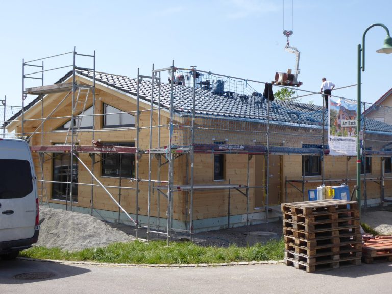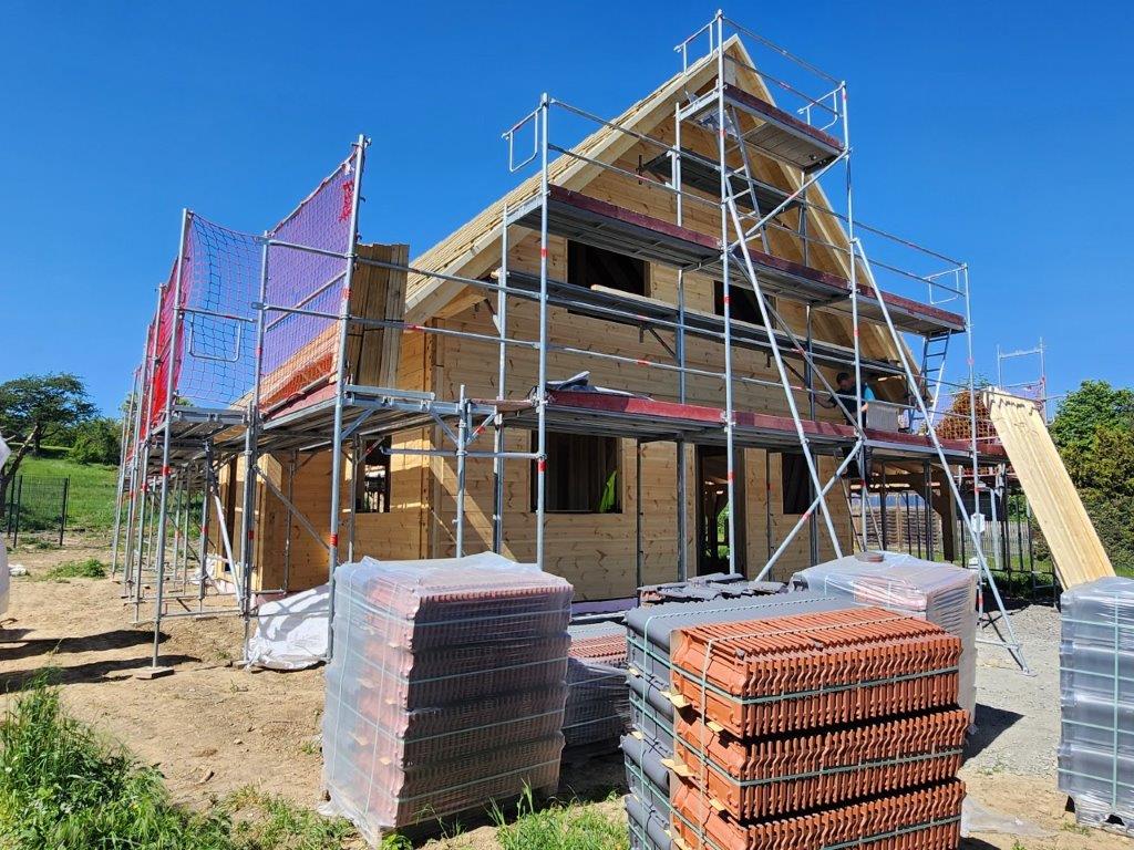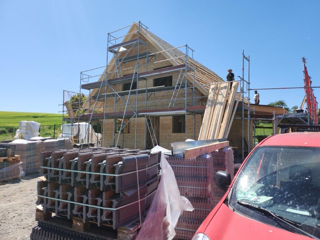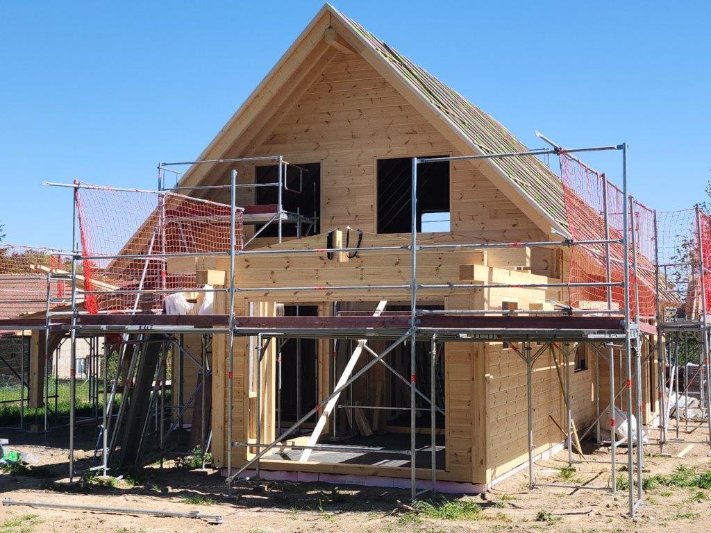 Mit viel Eigenleistung wird dieses Blockhaus in Richtmeistermontage gebaut, mit Wintergarten und Erker im Erdgeschoss.