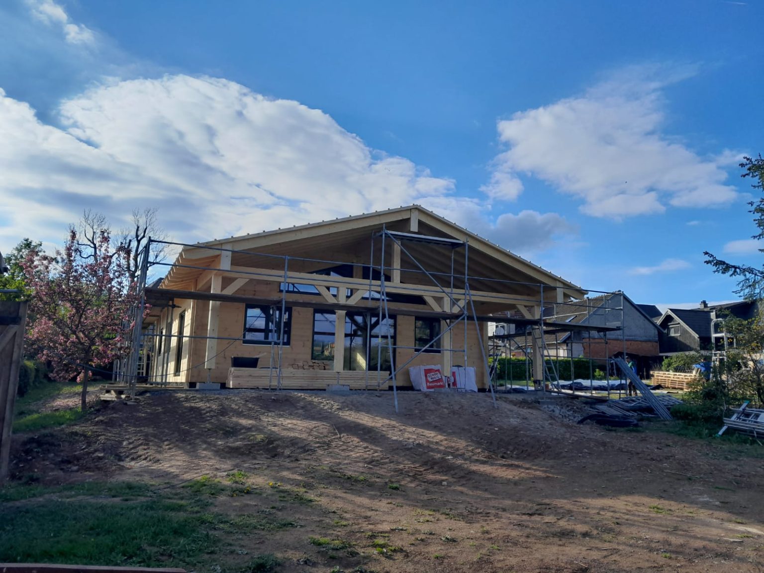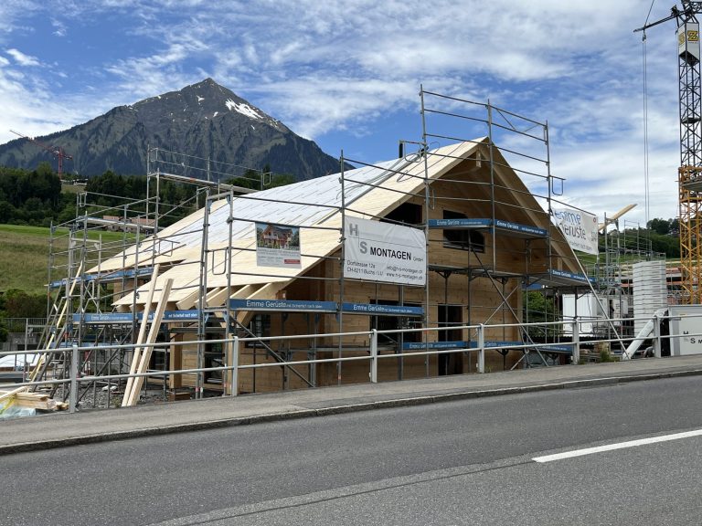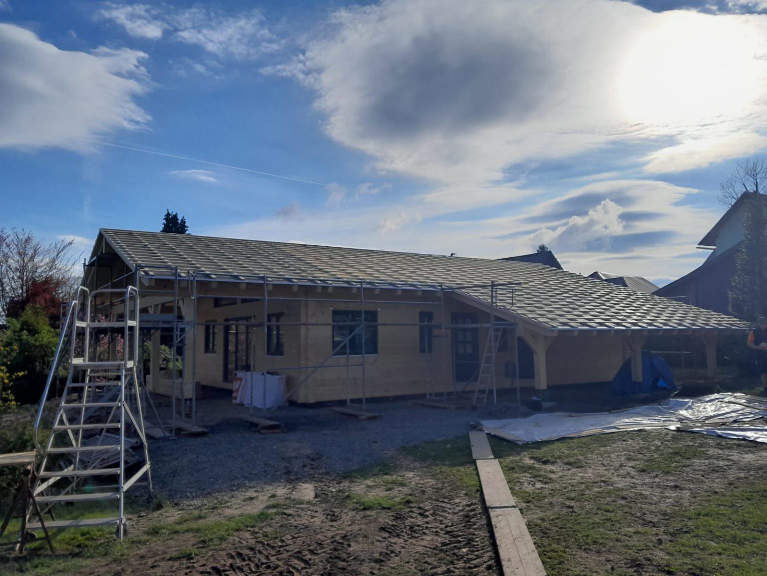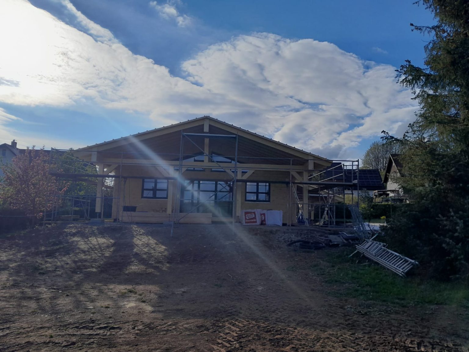 20cm massive Blockwand, 1-geschossig, ÜD-Terrasse, Abschleppung, Sichtdachstuhl mit Gutex-Aufdachdämmung, Richtmeistermontage