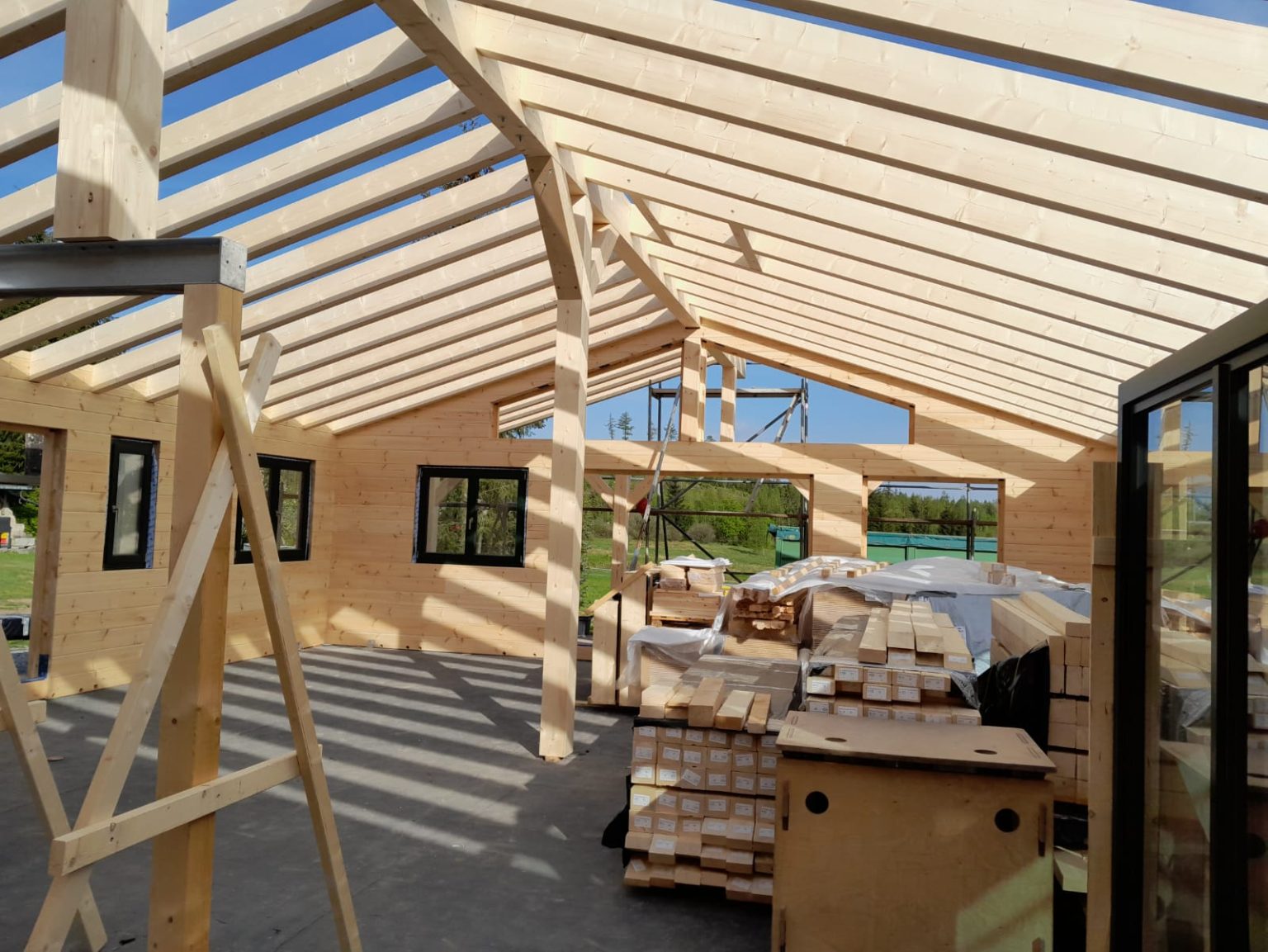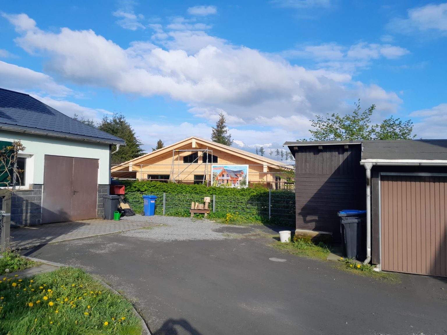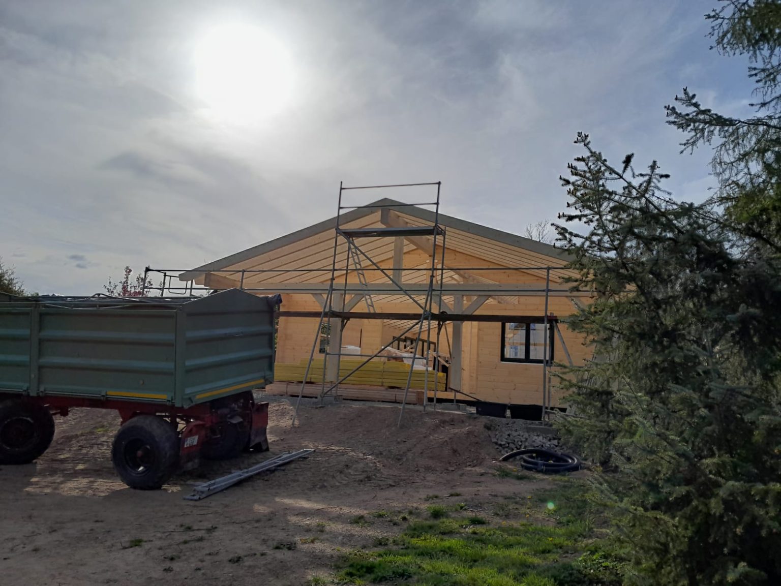 20cm massive Blockwand, 1-geschossig, ÜD-Terrasse, Abschleppung, Sichtdachstuhl mit Gutex-Aufdachdämmung, Richtmeistermontage
