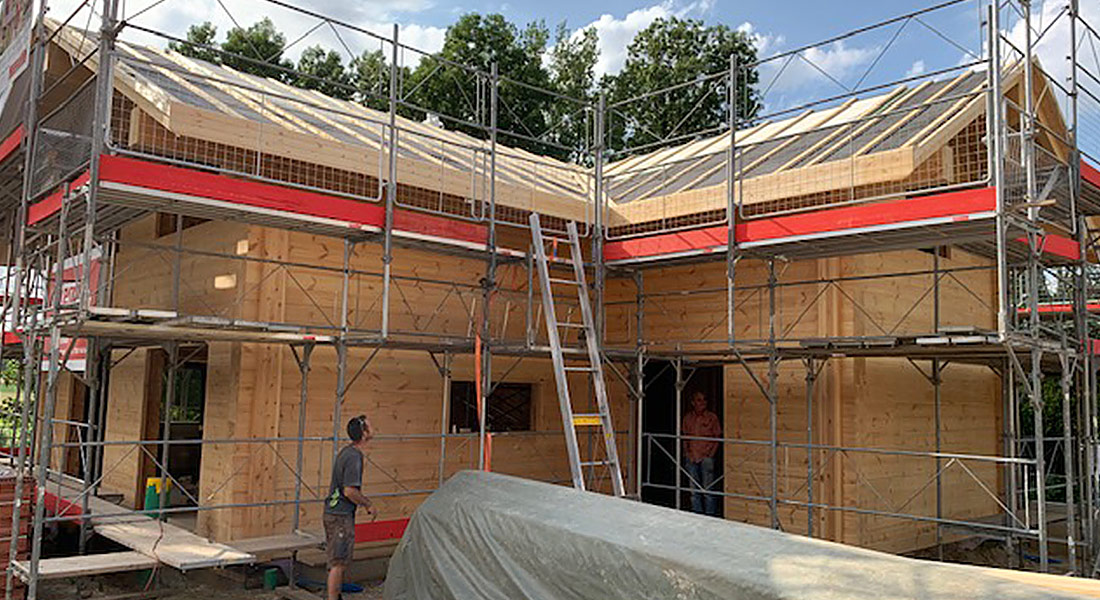 Da unsere schon perfekte Standard-Blockwand mit ihren 20cm Stärke in der Schweiz nicht zulässig ist und die Bauherrschaft unbedingt eine durch und durch massive, einschalige Holzwand will, sodass unsere im Kern gedämmte Kombiblockwand nicht für sie in Frage kommt, wird dieses Blockhaus mit der extradicken 27er-Blockwand gebaut. Zwei Quergiebel und Sichtsparren ergeben im Blockhaus imposante Architekturdetails. Die anspruchsvolle Bauherrschaft hat sich für Fullwood Wohnblockhaus entschieden, obwohl im Vorfeld ein Rundstammhaus geplant war.