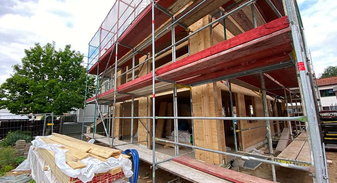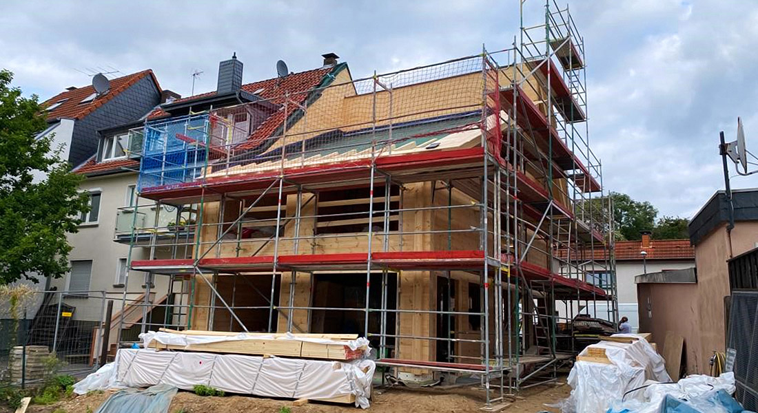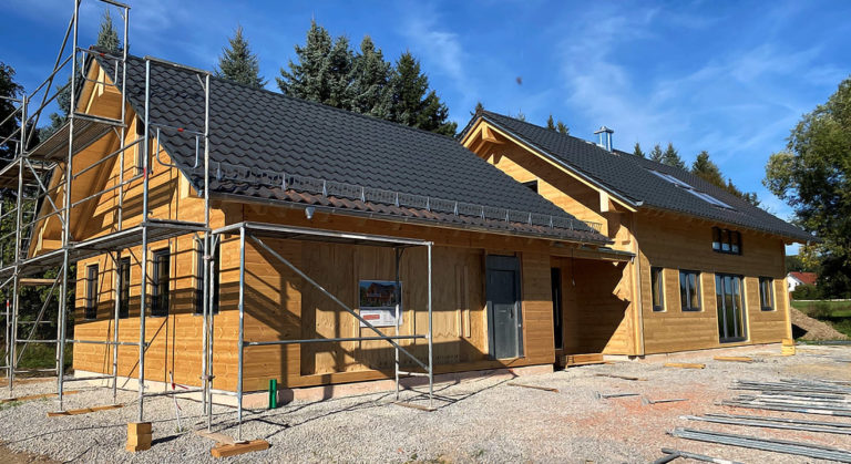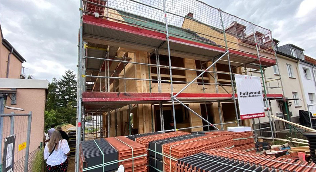 Dies ist nicht das erste Blockhaus, das Fullwood Wohnblockhaus in Köln baut. Einschalige, massive Blockwände werden auch in der rheinischen Metropole genehmigt und fügen sich bestens ins „Veedel“ (= Wohn-Viertel) ein! Dank glatter Wandstruktur, geradliniger Architektur und modern wirkendem Pultdach macht sich dieses Blockhaus sehr gut in der Nachbarschaft. Antrieb der Bauherrschaft ist eine möglichst ökologische, nachhaltige und schadstofffreie Bauweise ohne Wenn und Aber. Im Hausinnern imponiert schon in der Bauphase ein sichtbarer Dachstuhl.
