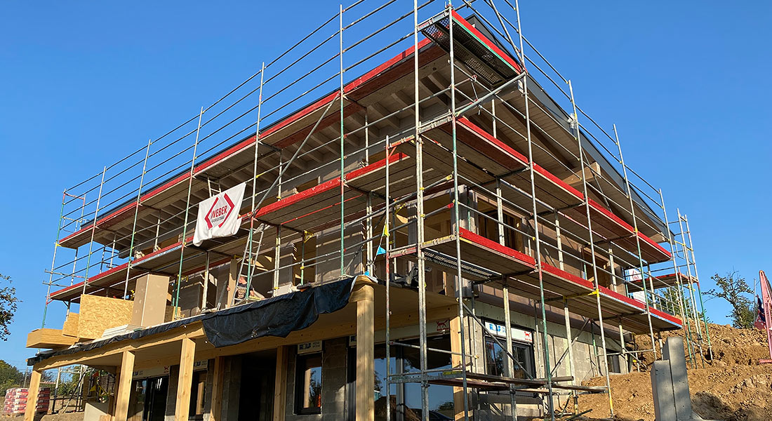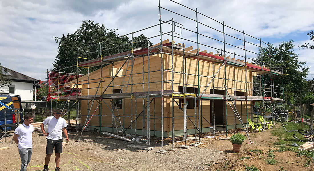 Viel Familiensinn beweist die Bauherrschaft, indem sie nicht nur für sich selbst baut, sondern auch für den Onkel ein kleineres Blockhaus in der Nachbarschaft aufstellen lässt. Ziel der Bauherren ist es, bei ihren Blockhäusern möglichst wenig Beton zu verwenden und so klimaneutral wie möglich zu bauen. Dazu gehören auch ein Gründach und natürlich die einschalige 20er Blockwand. Der Dachstuhl der modernen Pultdachhäuser bekommt – der geradlinigen Architektur entsprechend – eine schlichte Brettstapeldecke.