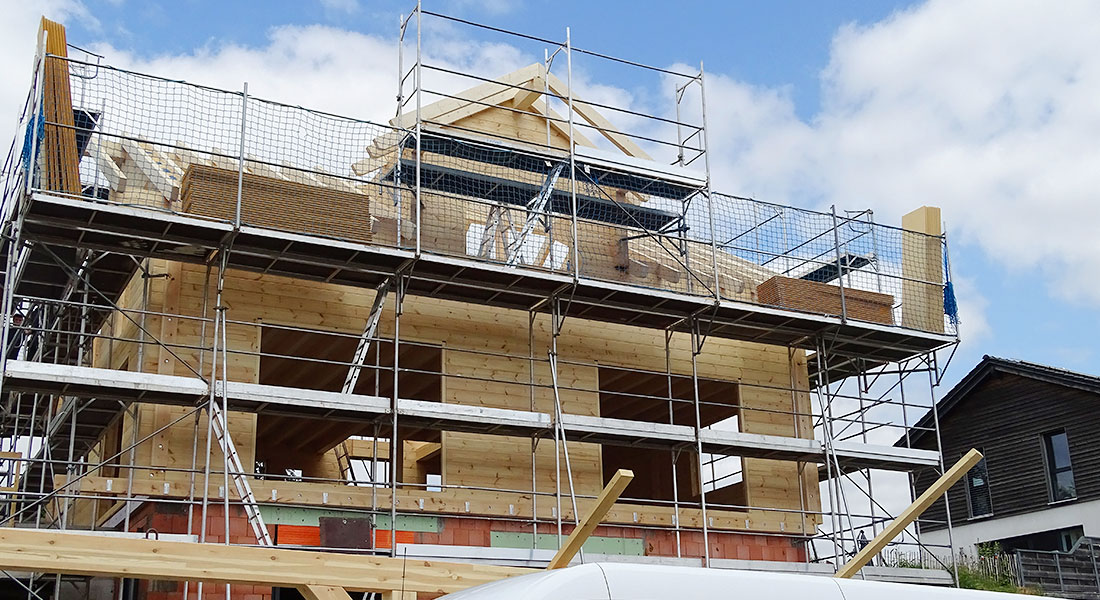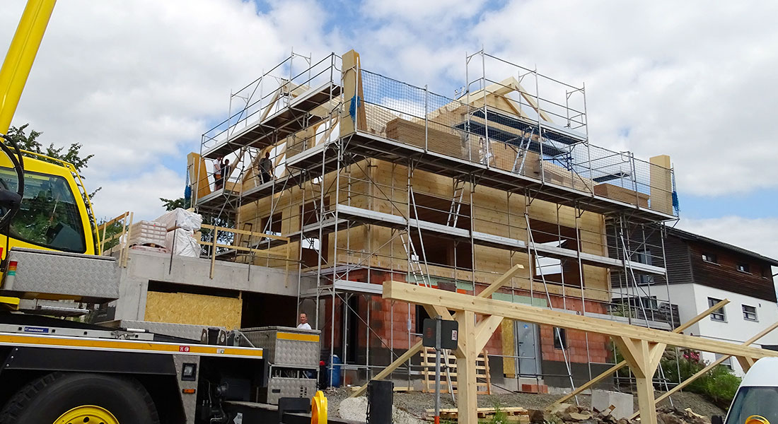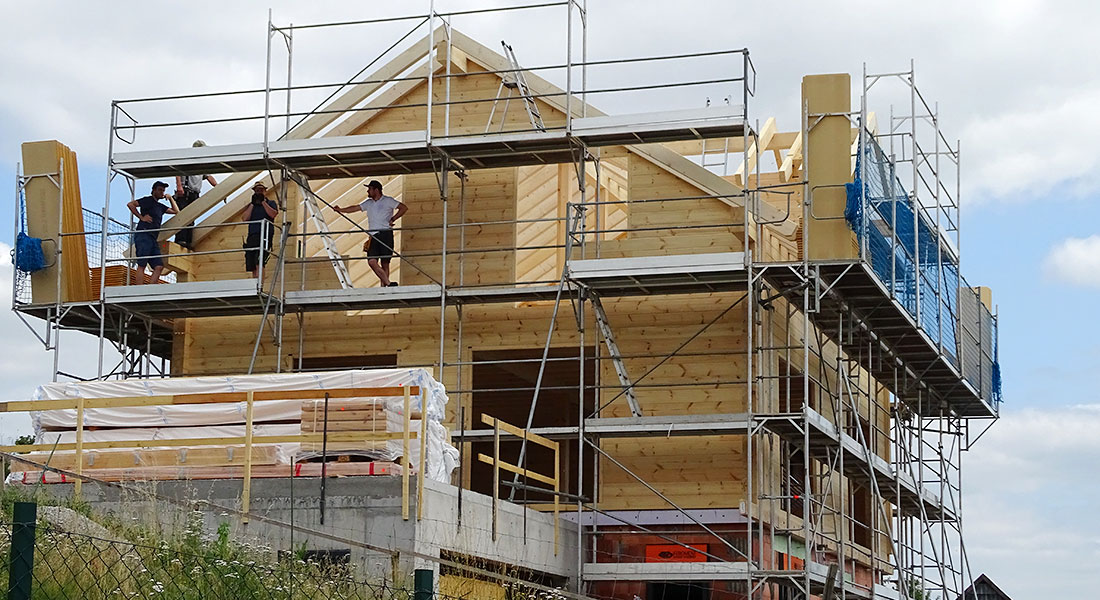 Hier baut ein Lehrerpaar sein Blockhaus in den großen Sommerferien. Mit viel Eigenleistung wird das Blockhaus in Richtmeistermontage aufgebaut. Derzeit wird weiter im Innenausbau nach Feierabend und an den Wochenenden gearbeitet, ebenfalls mit viel eigener Handarbeit.