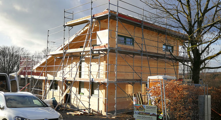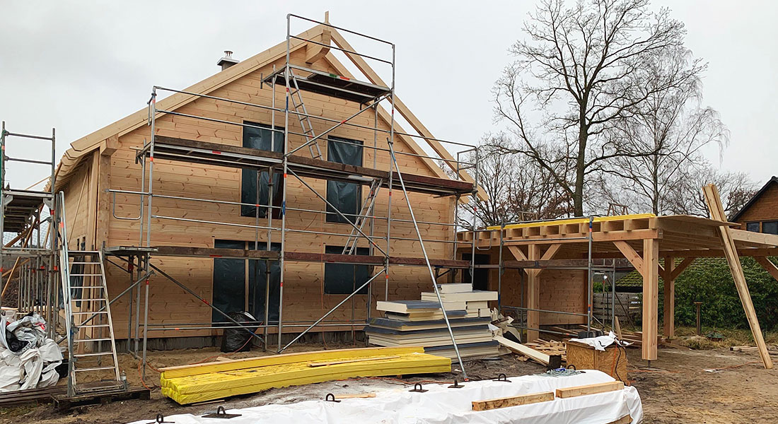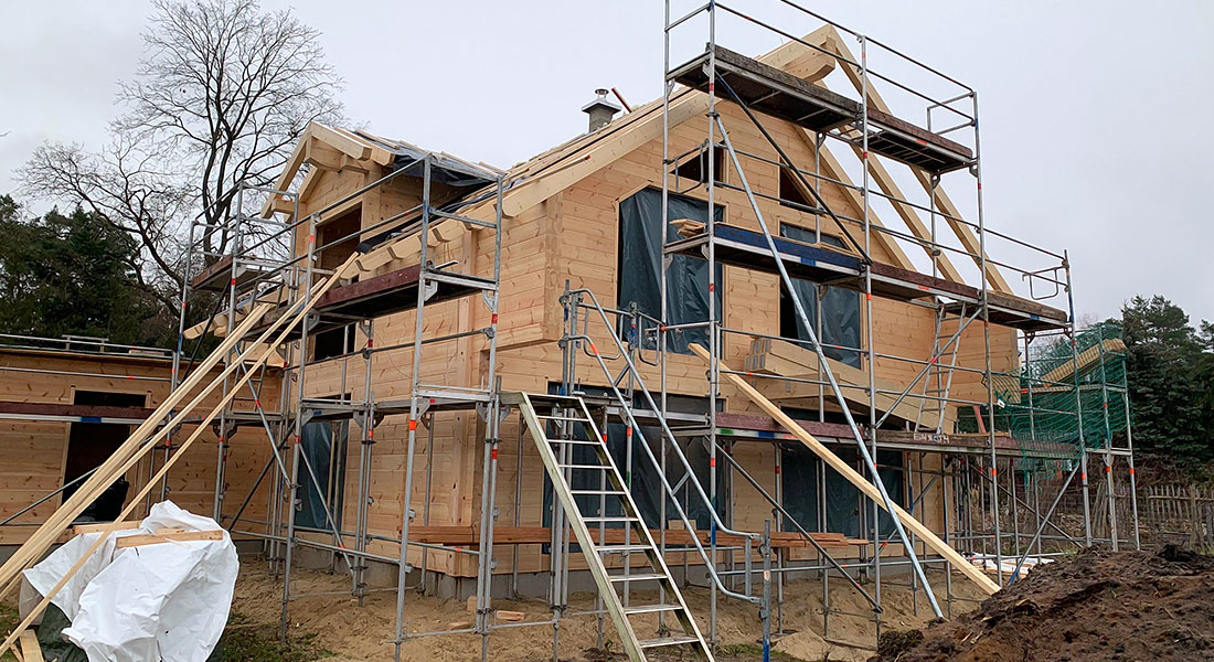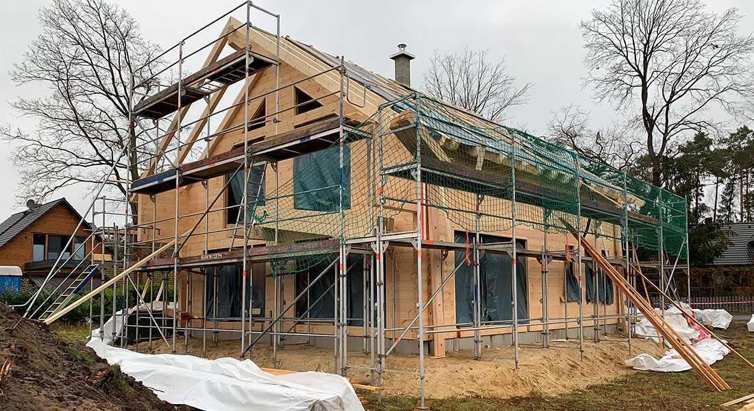 Inmitten eines Waldgebietes zwischen Elbe und Lüneburger Heide entsteht diese massive Blockhaus aus 20cm dicken Kiefernblockwänden. Um in unmittelbarer Nähe ihrer Pferde zu wohnen, kauft die Bauherrin mit ihrem Mann genau dieses Grundstück. Als Richtmeistermontage mit Sichtdachstuhl und Carport nimmt das Blockhaus Tag für Tag mehr Form an und wird zukünftiger Ausgangspunkt für Ausritte und Spaziergänge mit den Hunden.