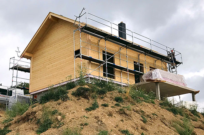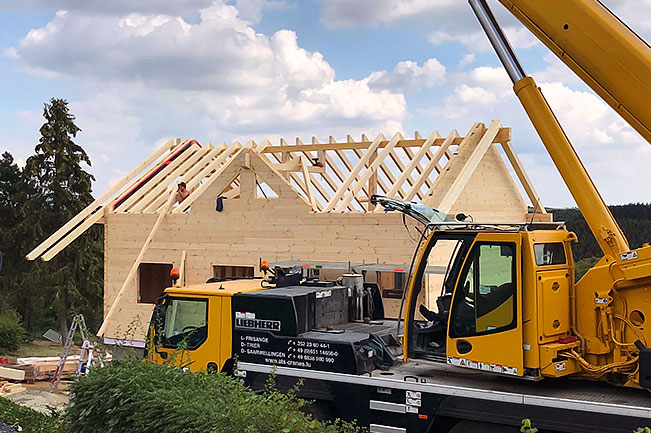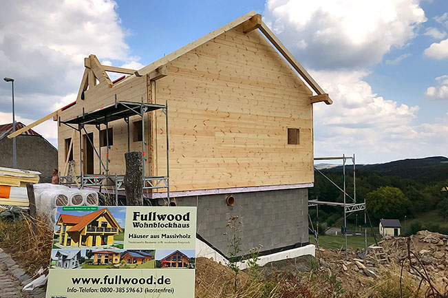 Wegen der Energievorschriften in Luxemburg entscheidet sich das Baupaar für die gedämmte Kombiblockwand von Fullwood Wohnblockhaus. Neben dieser Vollholzwand wäre für ein Blockhaus in Luxemburg auch die 27cm starke "Luxus-"Blockwand von Fullwood erlaubt gewesen, die aber deutlich teurer ist und zudem durch ihre Stärke einige Quadratmeter der Wohnfläche beansprucht. Das Blockhaus wird von Fullwood als Vollmontage auf den zuvor gebauten Keller gestellt, so kann die Bauherrschaft entspannt das Geschehen verfolgen. Durch die steile Hanglage kann der Keller auch als Wohn- oder Arbeitsbereich genutzt werden. Das Blockhaus selbst verfügt über 1,5 Geschosse und einen beeindruckenden Sichtdachstuhl.