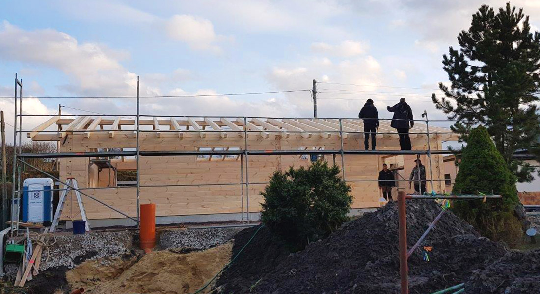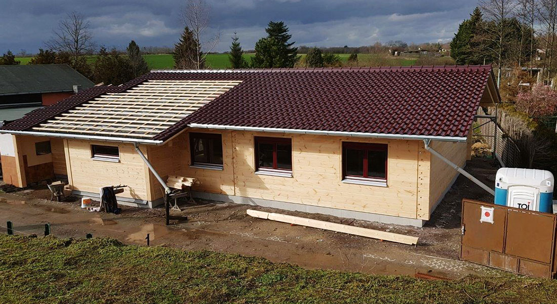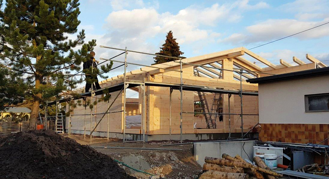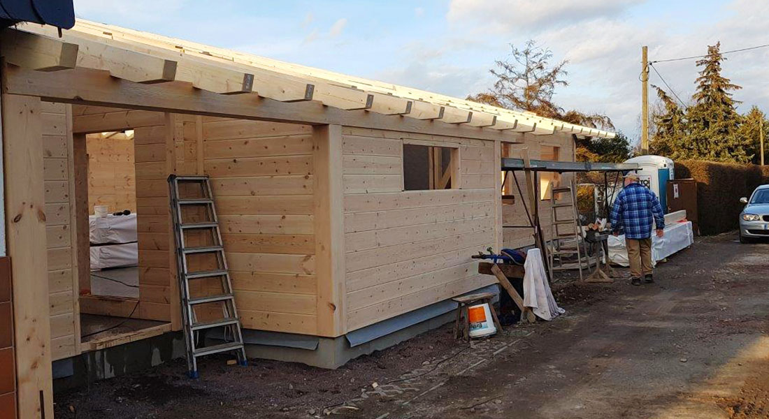Das Bestandsgebäude ist kein Blockhaus, sondern aus Stein gemauert. Dank der Setzungsfreiheit der 20er Blockwand von Fullwood ist es kein Problem, unterschiedliche Materialien miteinander zu kombinieren. Die Bauherrschaft erbringt viel Eigenleistung beim Innenausbau ihres Blockhauses und beschafft auch Dacheindeckung, Fenster und Türen in Eigenregie.
