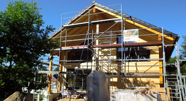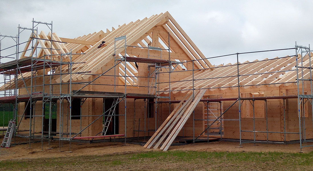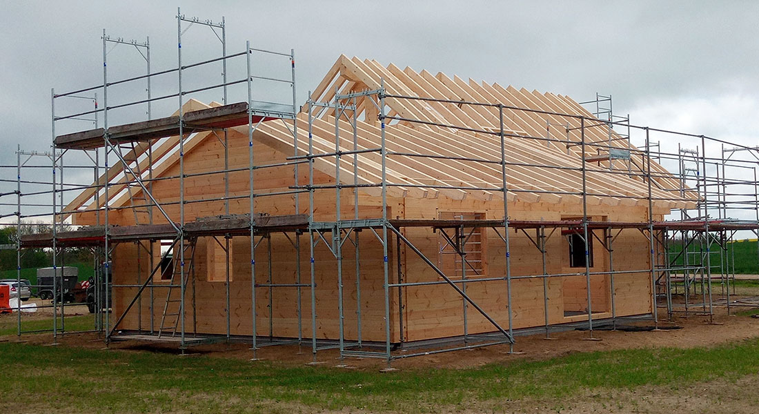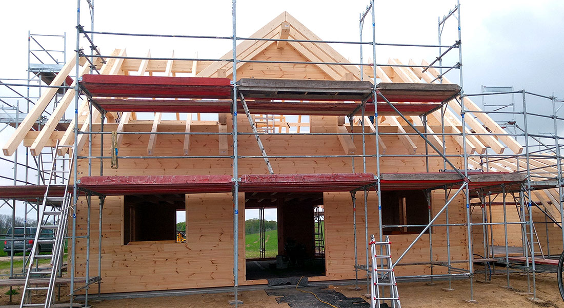 Als Betriebsleiterhaus mit Altenteil entsteht dieses durch und durch massive Blockhaus direkt auf einem Feld. Bauherren sind ein Vater und dessen Sohn mit Familie, die hier nicht nur ein neues Blockhaus Eigenheim bauen, sondern auch eine landwirtschaftliche Hofneugründung vornehmen. Fünf Tage ist der Fullwood-Richtmeister vor Ort (das Foto ist vom dritten Aufbautag, 11 Uhr) und wird von der gesamten Baufamilie und ein paar Freunden tatkräftig unterstützt.