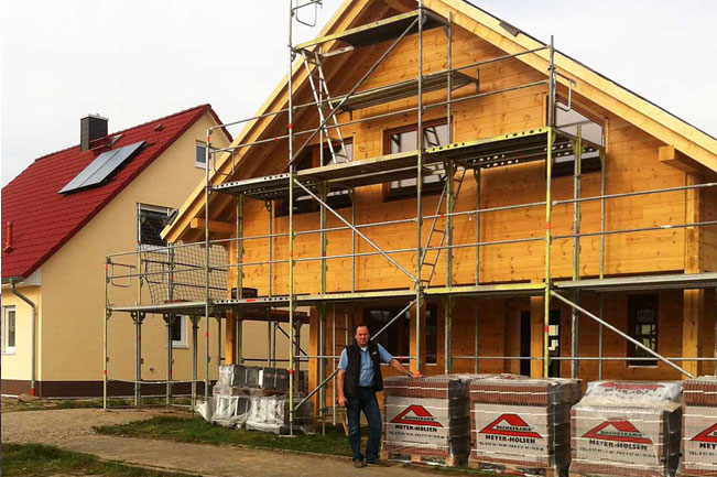 Ein junges Ehepaar baut bei Potsdam ein Blockhaus für sich und seine zwei Kinder.