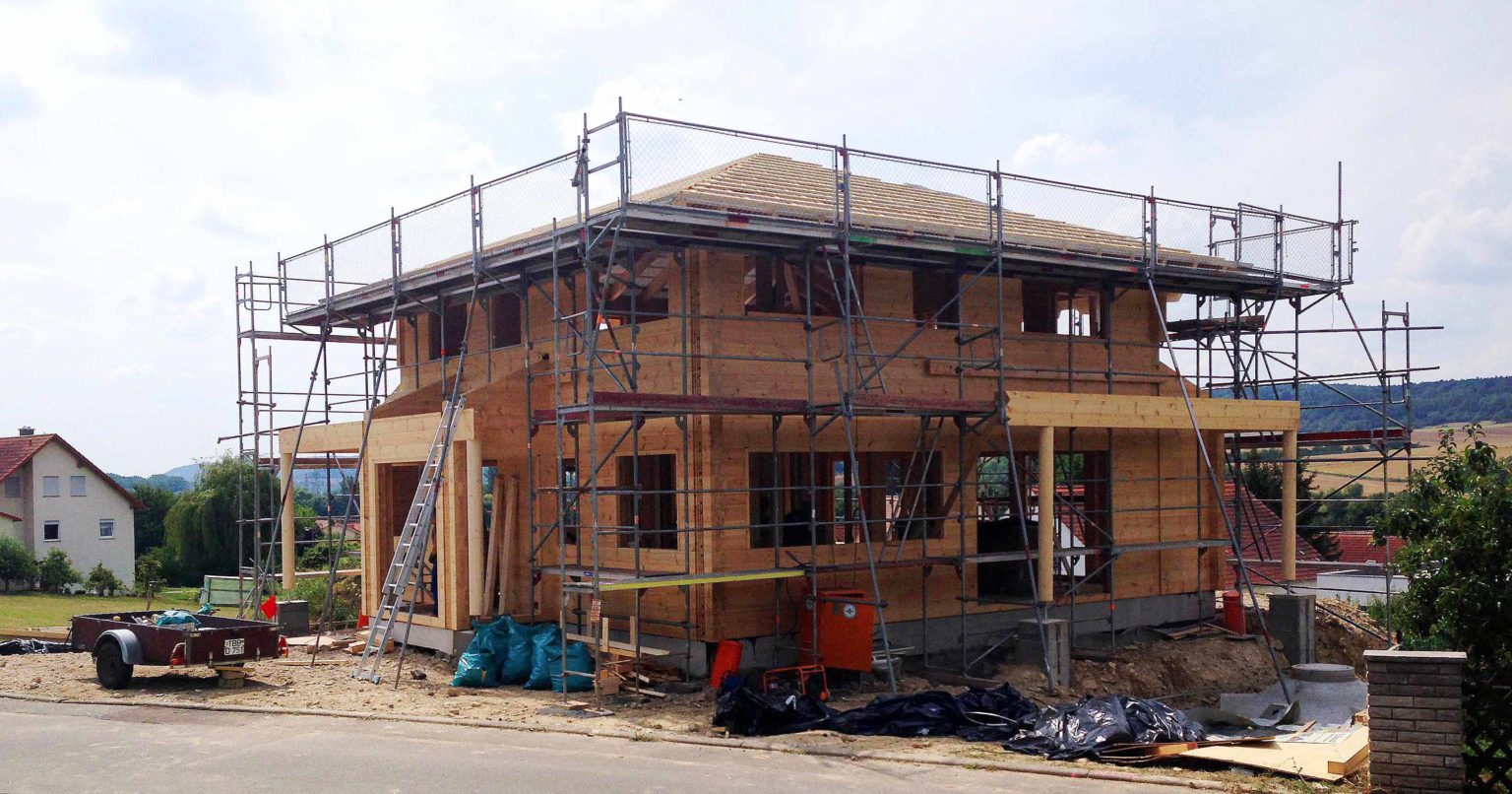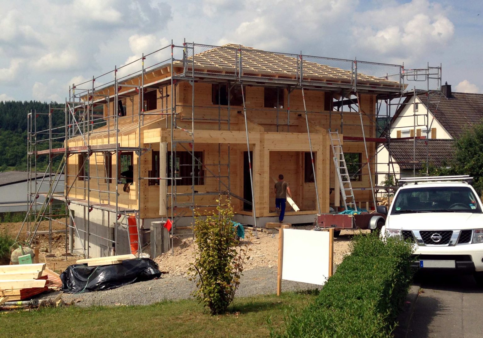 Ein neues massives Blockhaus im Stile einer Stadtvilla entsteht bei Tauberbischofsheim. Bei der Montage der vorgefertigten Wandelemente aus massivem Kiefernholz hilft die Baufamilie mit. Sie hat sich für eine Kosten sparende Richtmeistermontage entschieden und macht auch viele Arbeiten im Innenausbau selbst oder vergibt diese an Fachfirmen vor Ort. Die Nähe der Handwerksbetriebe zum Blockhaus ist nicht nur während der Bauphase von Vorteil, sondern auch später, falls mal etwas korrigiert oder gewartet werden muss. Fullwood selbst bietet mit seinen fünf deutschen und zwei Schweizer Standorten ebenfalls Ortsnähe zum Kunden und zur jeweiligen Baustelle. Die von den Bauherren gewünschte flache Dachneigung des Blockhauses erweitert das Platzangebot im Dachgeschoss, wovon die Bewohner später sehr profitieren werden.