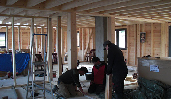 Ein modernes, schlichtes Blockhaus mit langer Dachabschleppung plante Fullwood Wohnblockhaus für die Bauherren. Man entschied sich für die bewährte 20-er Vollholzwand, die in der Praxis weitaus besser dämmt, als der errechnete U-Wert vermuten ließe. Die Fertigkonstruktion ist absolut winddicht und setzungsfrei, beste Voraussetzungen also zum Bauen, Gestalten und Wohnen. Noch gibt es aber viel zu tun, bis das neue Blockhaus bezogen werden kann.
