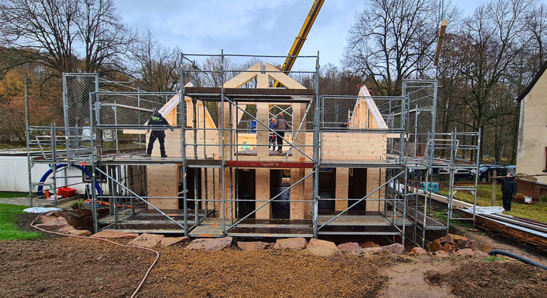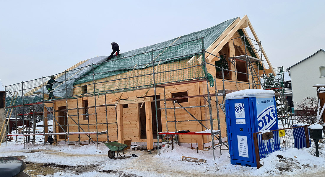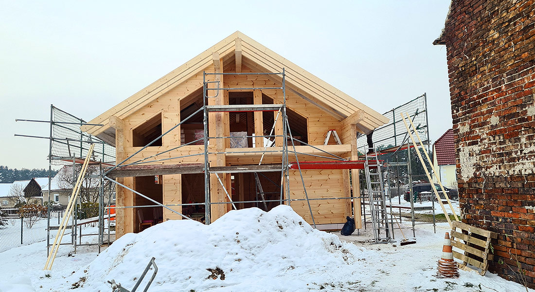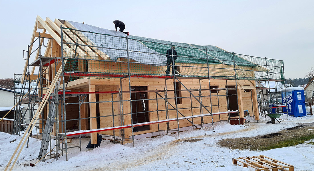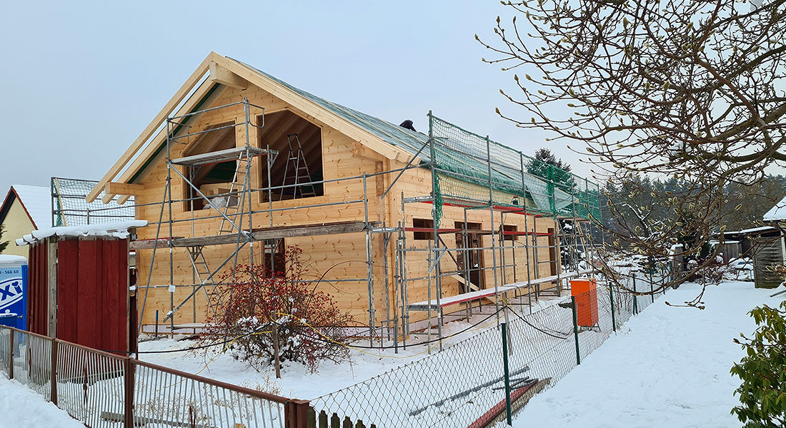 Ökologisch und nachhaltig ein Blockhaus bauen und dabei möglichst sparsam vorgehen. Geht das? Bei Fullwood Wohnblockhaus schon, da viele Baustufen möglich sind, bei denen die Bauherrschaft auf Wunsch so viel selbst bauen und ausbauen kann, wie sie möchte. So wird dieses anderthalb-geschossige Einfamilien Blockhaus als Richtmeistermontage geliefert und montiert, Aufsparrendämmung, Dacheindeckung und Haustechnik durch externe Handwerksbetriebe durchgeführt und der Innenausbau größtenteils in Eigenleistung bewältigt.