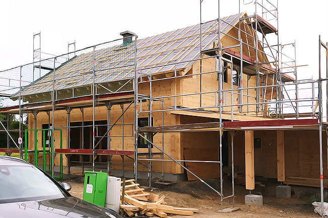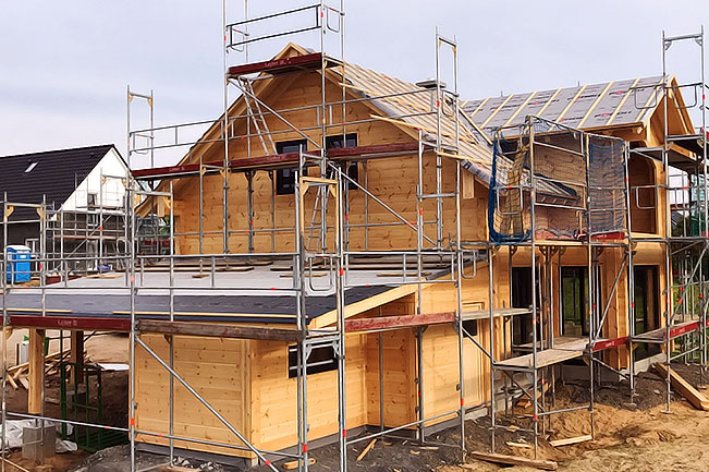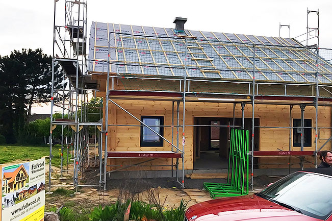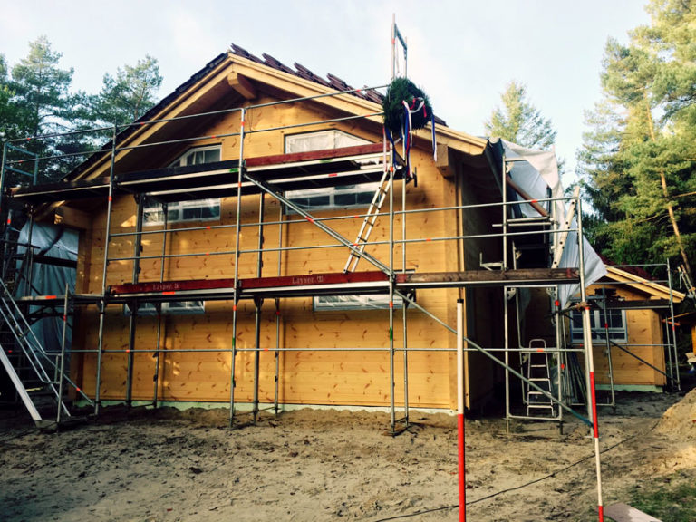 Fullwood und die Bauherren geben noch einmal mehr Gas als sowieso gewohnt, damit die Baufamilie nach drei Monaten (ab Montagebeginn) in ihr Blockhaus einziehen kann. Rundum perfekt wird das Blockhaus dann noch nicht sein, zumal der Innenausbau komplett in Eigenleistung erfolgt, aber gut bewohnbar sicherlich. Die Qualität der 20cm dicken Massivholzwände und deren Montage leidet natürlich nicht, das garantiert Fullwood. Die Erfahrung und Souveränität des Richtmeisters und der Fleiß seiner Helfer (Bauherren) tragen zur besonders fixen Montage bei.