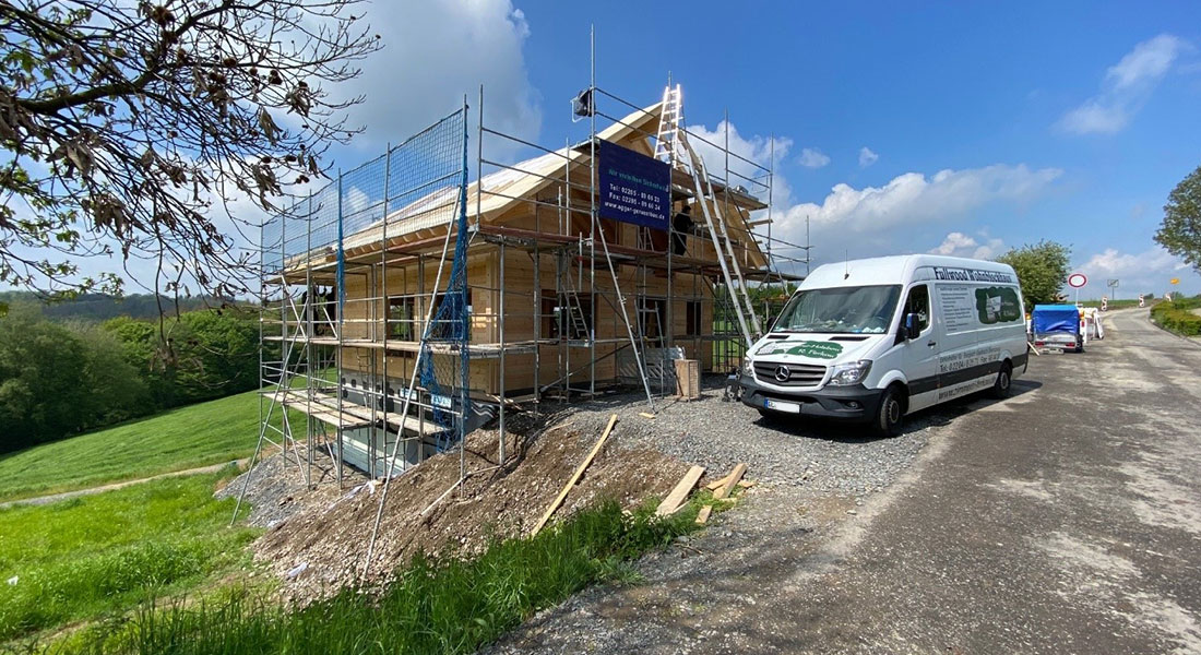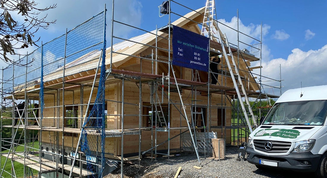 Auf Empfehlung eines befreundeten Fullwood Blockhaus Besitzers kommt ein junges Paar zu uns und baut nun sein eigenes, eineinhalbgeschossiges Blockhaus. Während im Erdgeschoss die einschalige Blockwand aufgestellt wird, entscheidet sich das Baupaar im Dachgeschoss für die im Kern gedämmte Kombiblockwand. Wie so viele wählen auch diese Bauherr*innen einen imposanten Sichtdachstuhl für ihr Traumhaus. Selbstverständlich helfen Sie und Er beim Hausbau und Ausbau mit, was zwar sehr anstrengend ist, aber Geld spart, die Verbindung zum Haus noch mehr stärkt und sogar Spaß macht!
