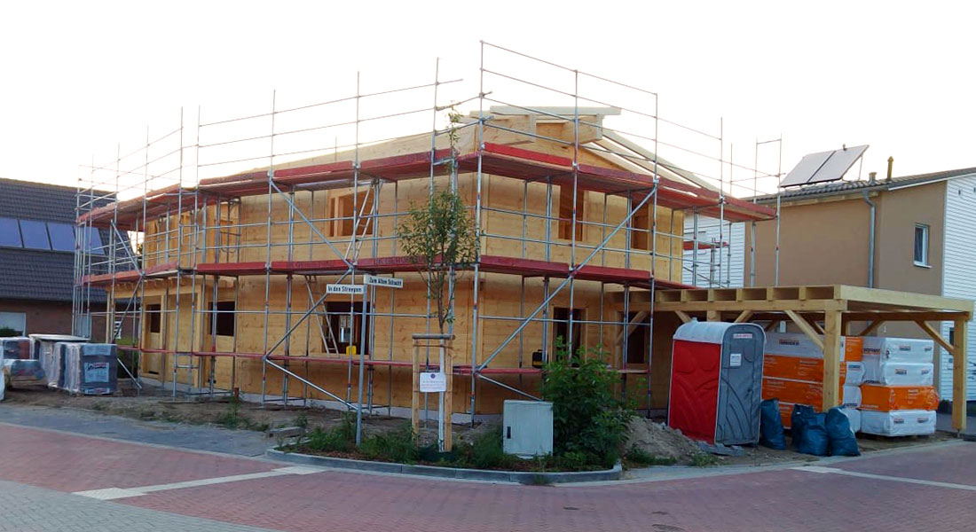 Neben einem sichtbaren Dachstuhl ist den Bauherren der Schallschutz zwischen den beiden Blockhaus Hälften besonders wichtig. Für ihr Blockhaus wählen sie die Fullwood-Kombiblockwand, teilen sich einen Doppelcarport mit angeschlossenem Hausanschlussraum und glänzen durch sehr viel Eigenleistung beim Hausbau.