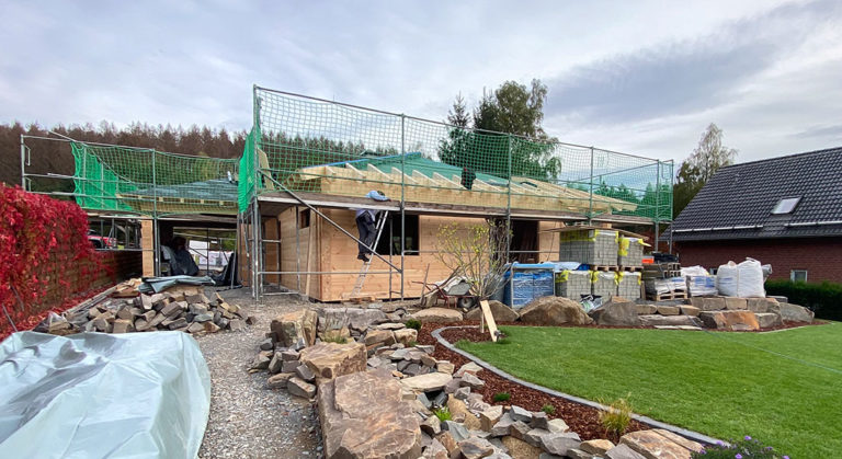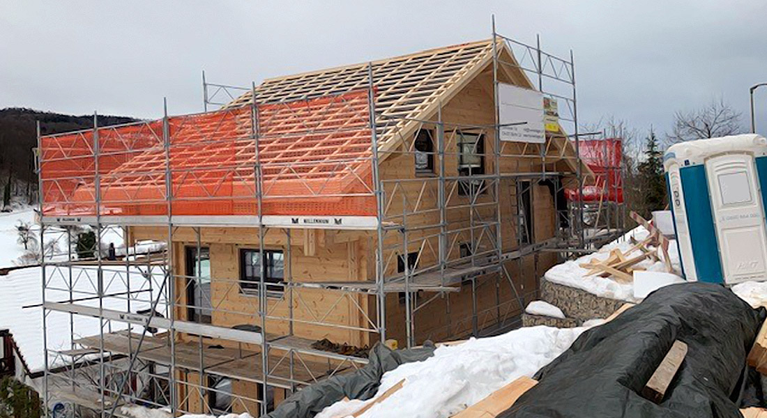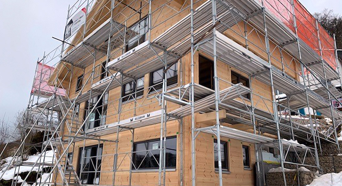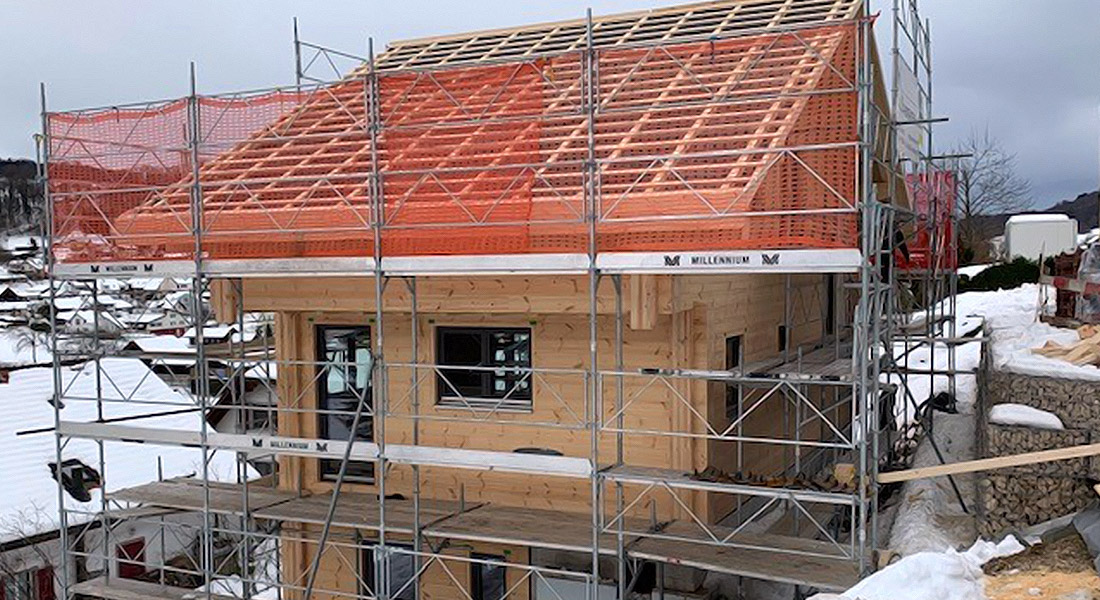 Nur 4 Kilometer südlich der Grenze zu Deutschland wird dieses exklusive Blockhaus ganz nach den Wünschen der anspruchsvollen Bauherrin in der Schweiz errichtet. Wie die meisten unserer Schweizer Kunden entscheidet sich auch diese Bauherrin für unsere 27cm dicke, massive und einschalige Kiefernblockwand – die bei uns intern als „Königsklasse“ bezeichnet wird. Auch aufgrund der steilen Hanglage sind die Wohnebenen im Blockhaus versetzt und sorgen für eine innenarchitektonisch besonders interessante Gestaltung.