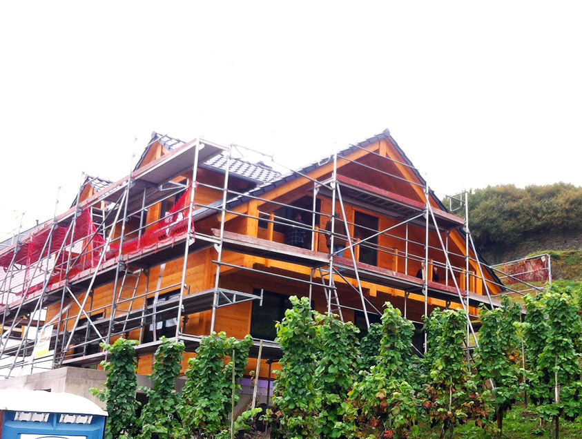 Der Platz für den Keller, auf dem dieses Blockhaus aufgebaut wird, wird eigens in den Weinberg hineingesprengt, bevor die Bauarbeiten beginnen Mittlerweile schreitet die Montage der massiven Holzwände rasch voran. Das erfahrene Fullwood-Team arbeitet effizient, sorgfältig und schnell. Dank der genauen Vorarbeit im Werk, wo die 20cm dicken Vollholzwände passgenau produziert werden, laufen die Arbeiten am Blockhaus störungsfrei ab. Für den Innenausbau engagiert der Bauherr selber Fachhandwerksbetriebe vor Ort.