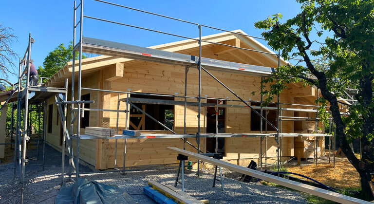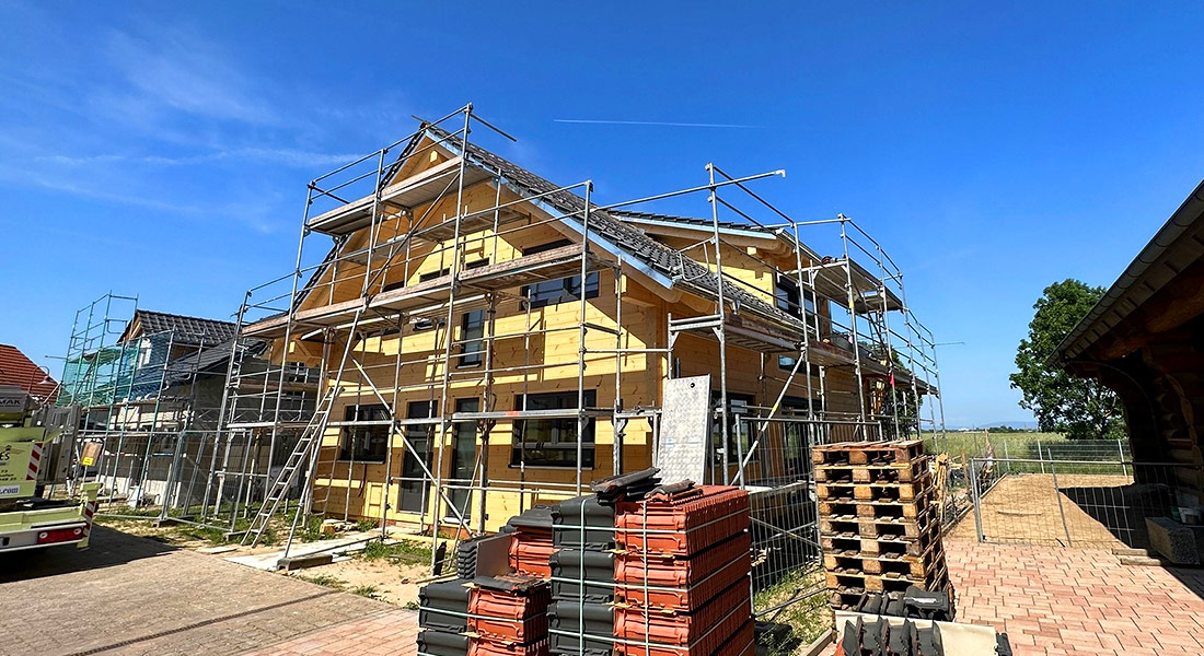 Wenn bauen, dann ein Blockhaus in ökologischer Bauweise. Für sich und die beiden erwachsenen Töchter errichtet das Baupaar ein Zweiparteien Blockhaus aus massivem Holz. Die Richtmeistermontage wird mit viel Eigenleistung und Fleiß angegangen und die vorgefertigten Blockbohlenwände auf einen Fertigkeller gesetzt. Von der großen Gaube im Dachgeschoss hat man jetzt schon einen schönen Blick auf den Speyrer Dom.