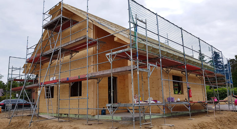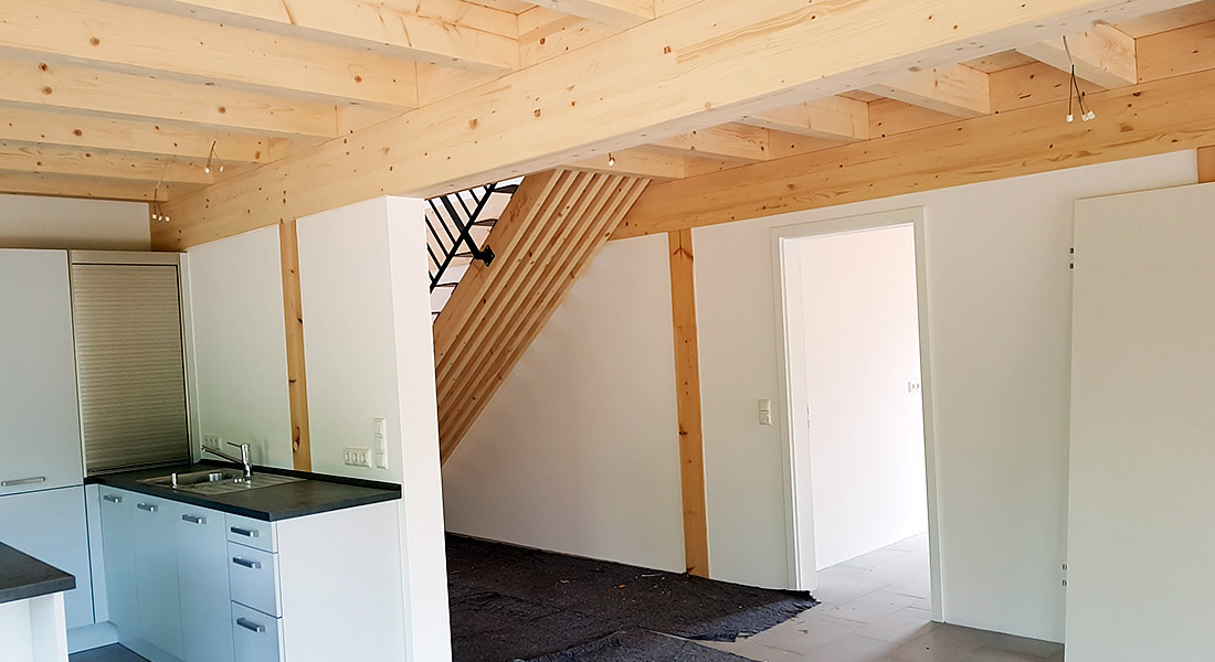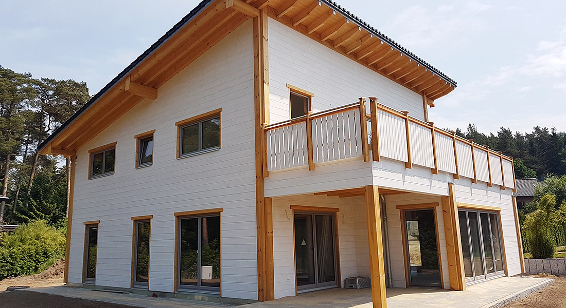 Im Innern des Blockhauses beließ der Bauherr das Holz naturfarben, schützt es aber mit UV-Schutz vorm Nachdunkeln und kombinierte weiß gestrichene, leichte Trennwände dazu. Dank des gewählten Pultdaches mit hohem Kniestock besitzt dieses Blockhaus zwei Vollgeschosse und wirkt optisch besonders modern. Seit den Fotos ist einige Zeit verstrichen und der Bauherr frönt schon ganz dem Genusswohnen in seinem Fullwood Wohnblockhaus.