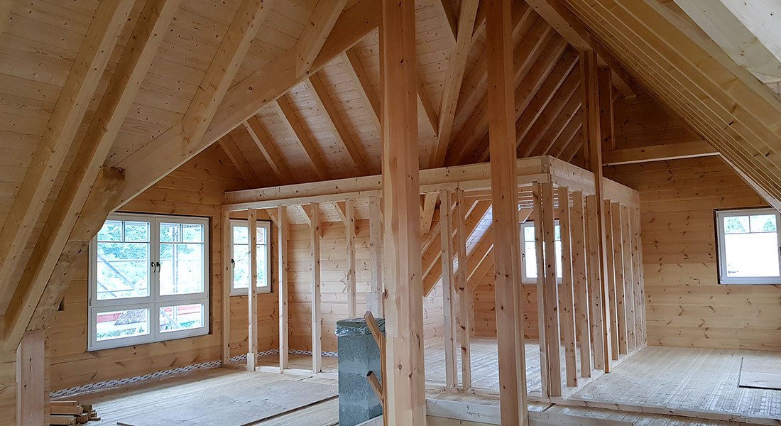 Beim Entwerfen und Planen dieses Blockhauses verwirklicht die Bauherrin komplett ihre eigenen Ideen. Glücklicherweise kann alles auch so realisiert werden, wie es sich die Kreative und ihr Mann vorstellen. Drei spitze Gauben vergrößern den Wohnraum unter dem 50° geneigten Satteldach erheblich und zwei kreisrunde Fenster neben der Haustüre verleihen dem im Ausbau befindlichen Blockhaus ein markantes Gesicht. Derzeit werden Haustechnik und Innenausbau von ortsansässigen Handwerkern durchgeführt.