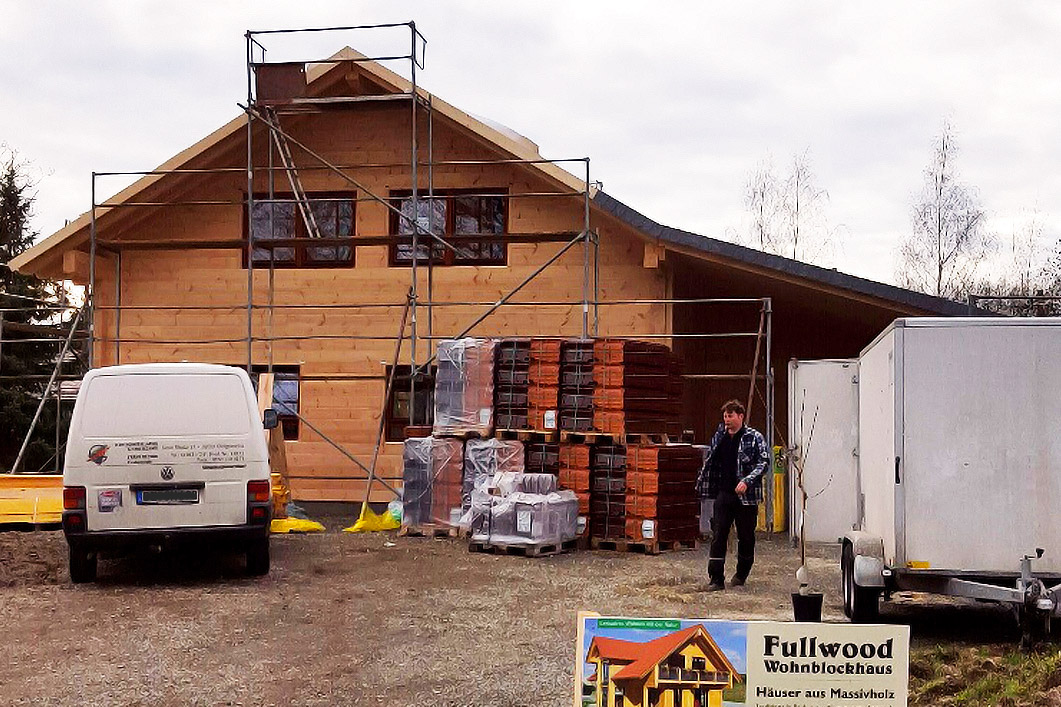 Die Baufamilie, Eltern mit Töchtern im Teenageralter, ist mit dem Baufortschritt sehr zufrieden und freut sich auf den baldigen Einzug in ihr Familien Blockhaus. Um die Pkws trocken unterzubringen, lässt die Bauherrschaft gleich einen stabilen Doppelcarport an ihr Blockhaus anbauen. Somit ist immer ein Zugang trockenen Fußes vom Auto ins Blockhaus, und umgekehrt, garantiert.