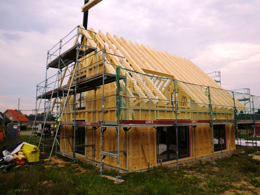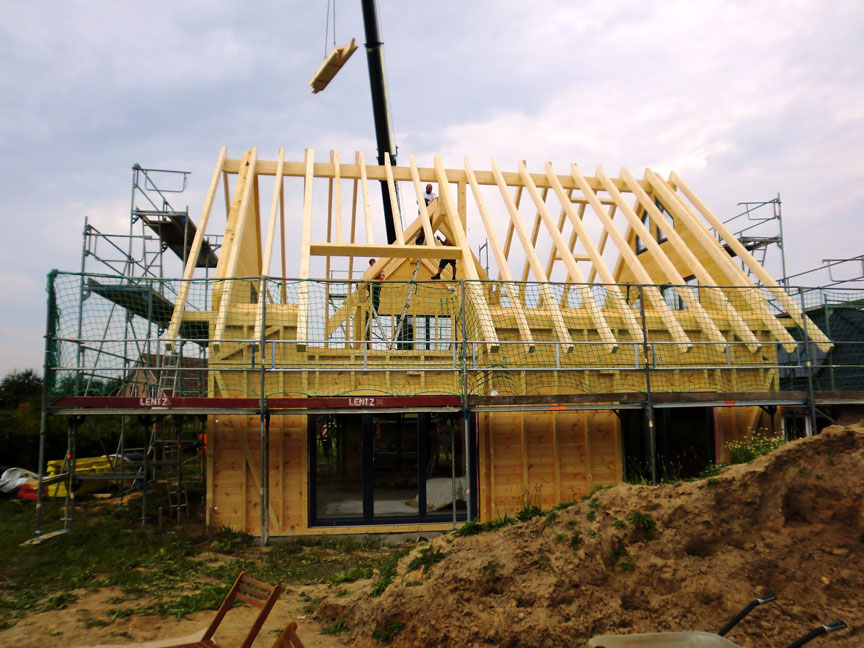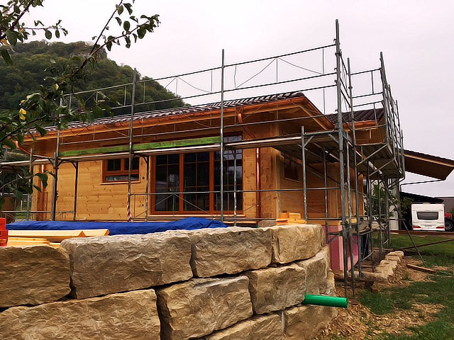 Leider schreibt das Bauamt am Standort eine verklinkerte Außenfassade für das Blockhaus vor. Da die Bauherrschaft in den Genuss des gesunden Wohnklimas, das in einem echten Blockhaus von Fullwood herrscht, kommen möchte und auch aus ökologischen Gründen auf ein Blockhaus als Eigenheim setzt, geht man folgenden Kompromiss ein: Die bewährte Fullwood-Kombiblockwand, bei der die 9cm dicken, massiven Holzbohlen normalerweise außen liegen, wird kurzerhand umgedreht, so dass nun innen das original Blockhaus-Feeling mit allen Vorteilen herrscht, und außen Trägerplatten montiert werden, die verklinkert werden müssen. Dazwischen befinden sich eine natürliche Dämmschicht und eine Installationsebene. Wieder einmal löst Fullwood ein Problem, indem eine unkonventionelle, individuelle Lösung gefunden wird, welche die Baufamilie zufrieden stellt.