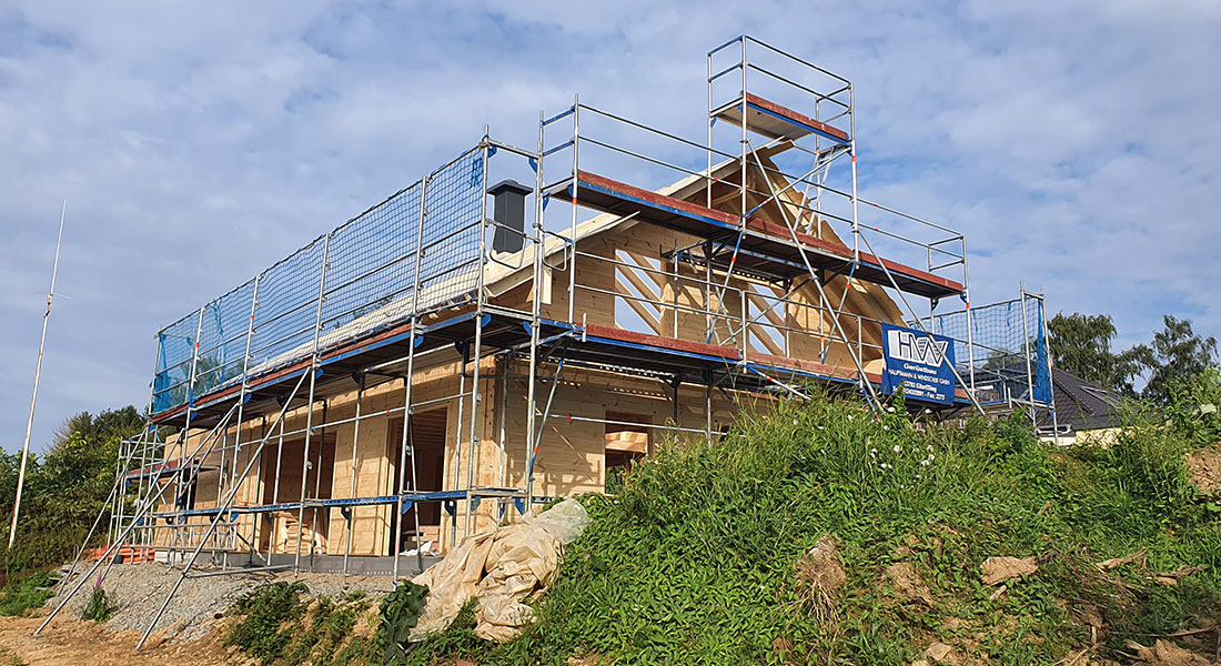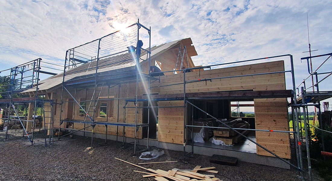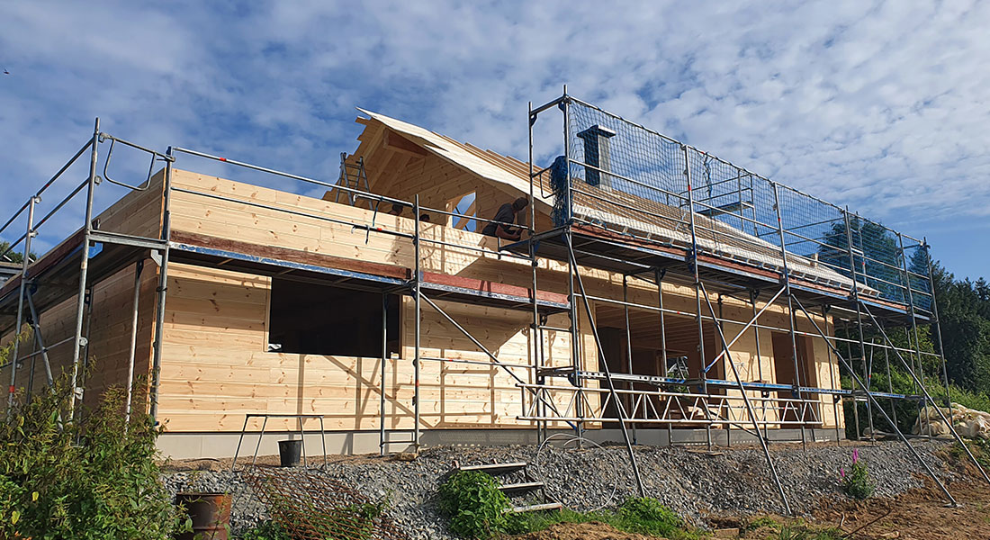 Genau an der Stelle, wo früher das Elternhaus eines der Bauherr:innen stand, entsteht jetzt das neue Blockhaus des Baupaares. Mit viel Eigenleistung und Eifer ist das Paar bei der Sache um das individuell geplante Blockhaus samt großer Garage (mit Dachterrasse) zu errichten. Montiert wird die Kombiblockwand inklusive Kerndämmung.