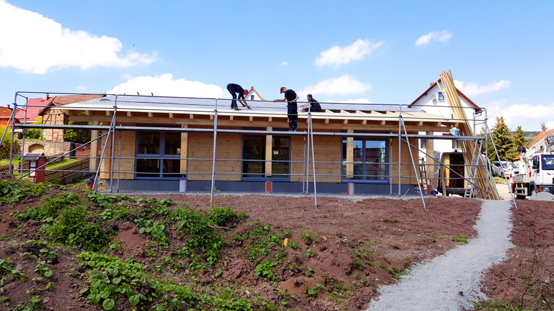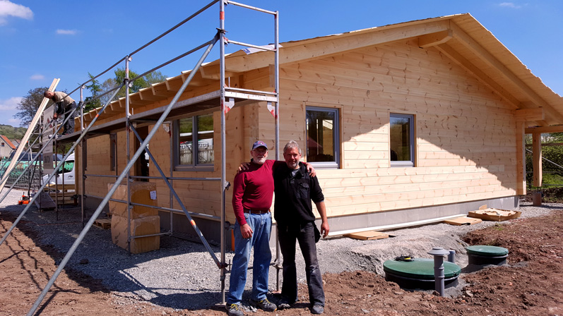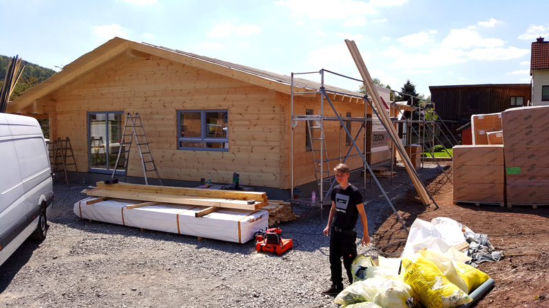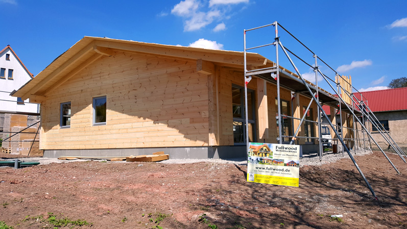Noch ein eingeschossiges Blockhaus entsteht im östlichen Teil Mitteldeutschlands. Dem Blockhaus wurden bereits große, bodentiefe Fenster eingebaut, die reichlich Tageslicht herein lassen. Denn genau wie die allermeisten Bauherren wollen auch diese viel natürliches Licht in ihrem wohnlichen Blockhaus - düster war vorgestern! Geplant wurde das helle Blockhaus in Thüringen als Altersruhesitz, wobei seine Bauherren noch sehr aktiv und fit sind, so sehr, dass sie mit viel Eigenleistung ihr Blockhaus auf- und ausbauen.