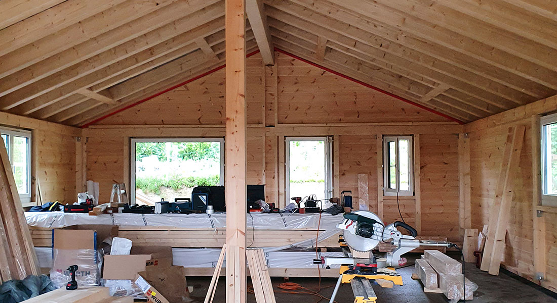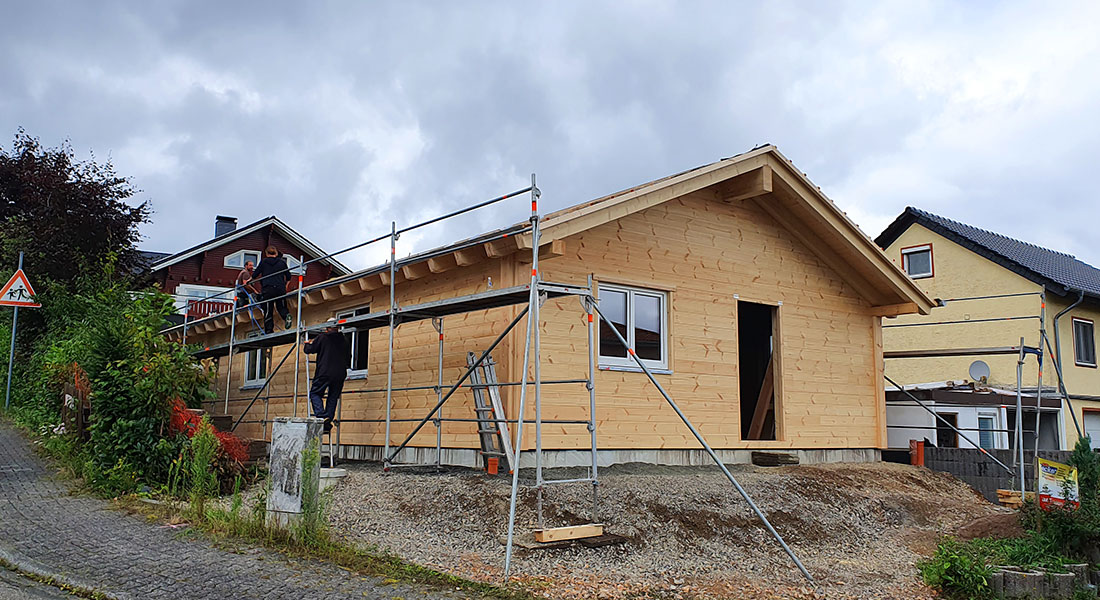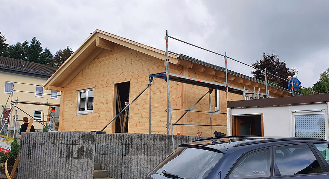 Mit Unterstützung von Bruder und Vater baut hier eine Mutter für ihre zwei Kinder und sich ein eingeschossiges Blockhaus. Viel Eigenleistung soll erbracht werden, weshalb die Bauherrin sich für eine kostensenkende Richtmeistermontage entscheidet. Dieses Blockhaus wird mit der gestalterisch flexibleren Kombiblockwand mit 9cm dicken Blockbalken, Kerndämmung und Installationsebene montiert. Auch diese Wand ist setzungsfrei, wertstabil und besonders energieeffizient.