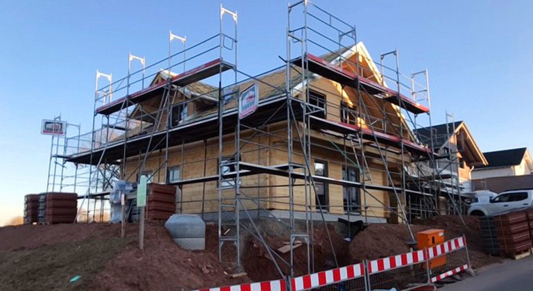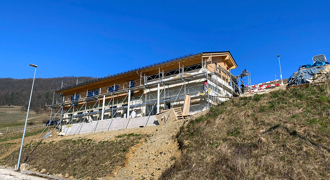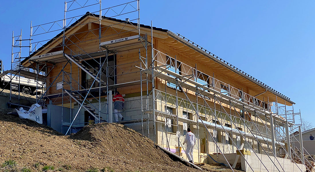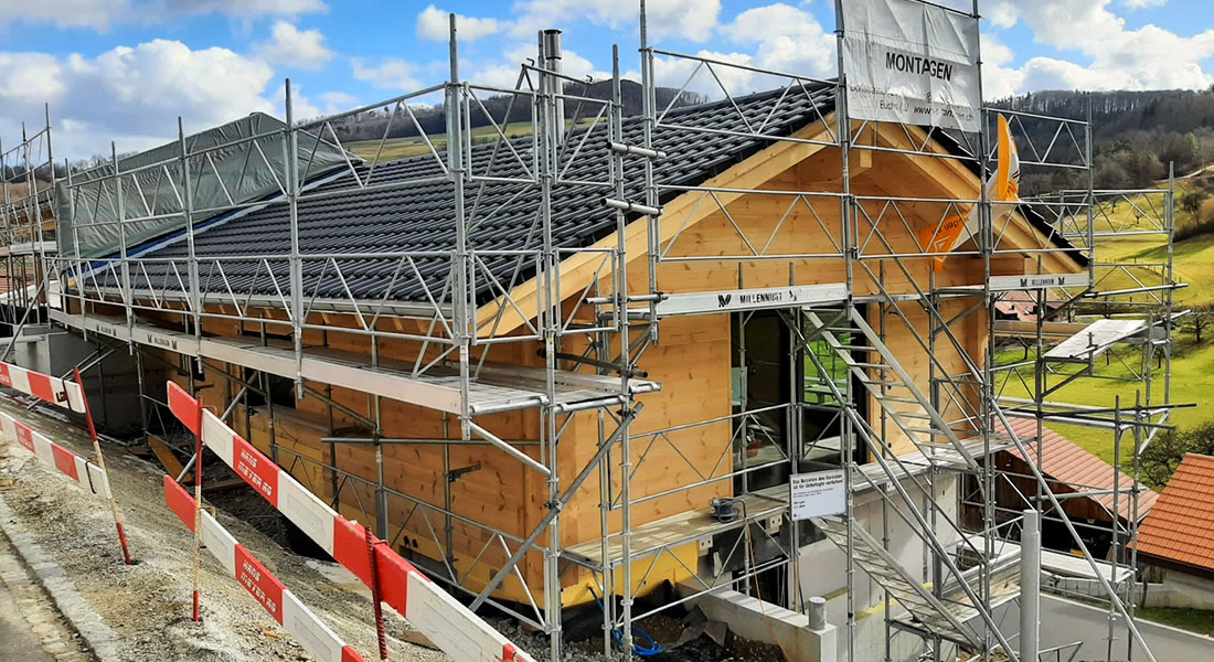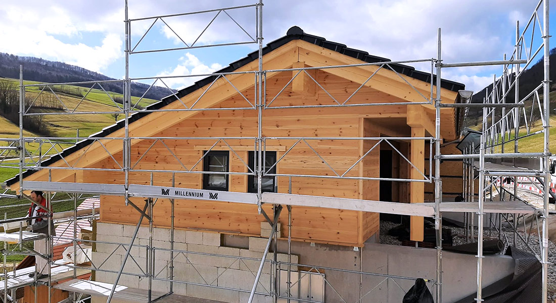 Dieses besonders großzügige Blockhaus (27er Blockwand, intern auch die „Königsklasse“ genannt) entsteht in steiler Hanglage, was ein gemauertes (Beton) Untergeschoss erfordert. Der vordere Teil des Kellergeschosses ist zum Tal hin mit großen Fenstern versehen. Dort befindet sich später ein schöner Wellnessbereich. Auch ein Außenpool ist geplant – so lässt es sich aushalten. Nicht nur schöner Luxus, sondern auch Energieeffizienz und nachhaltige Bauweise sowie die Verwendung erneuerbarer Energien sind der Bauherrschaft wichtig. Deshalb baut sie ein ökologisches, klimaneutrales Blockhaus mit Fullwood und setzt, um nur ein Beispiel zu nennen, eine Photovoltaikanlage auf's Hausdach. Auch die Blockhaus Montage führt Fullwood durch.