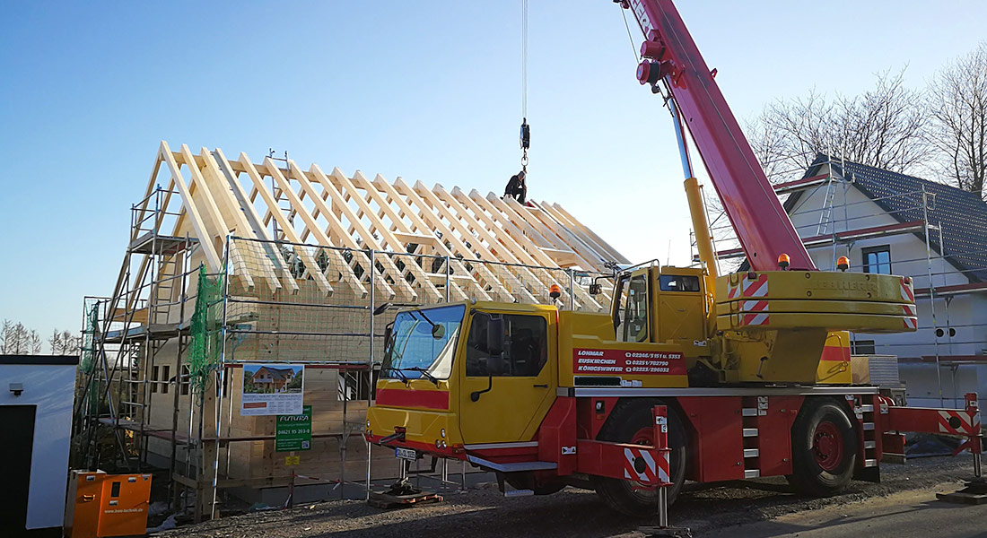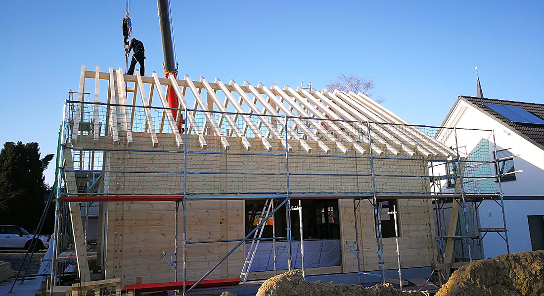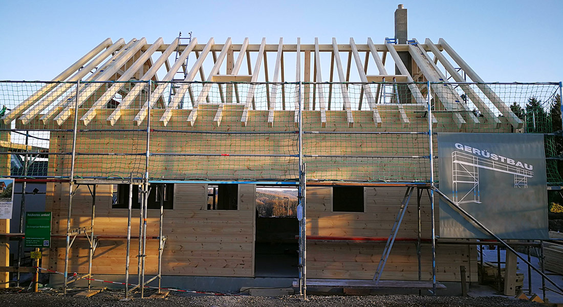 Hier entsteht ein individuelles Blockhaus für einen sehr holzaffinen Bauherrn, der sogar eigenen Wald besitzt. Das Holz der Wände für das Blockhaus stammt allerdings aus Skandinavien, da Polarkiefern wegen langsameren Wachstums in der Kälte besonders festes Holz hervorbringen. Da die Baufamilie viel selbst machen möchte, entscheidet sie sich für eine Richtmeistermontage.