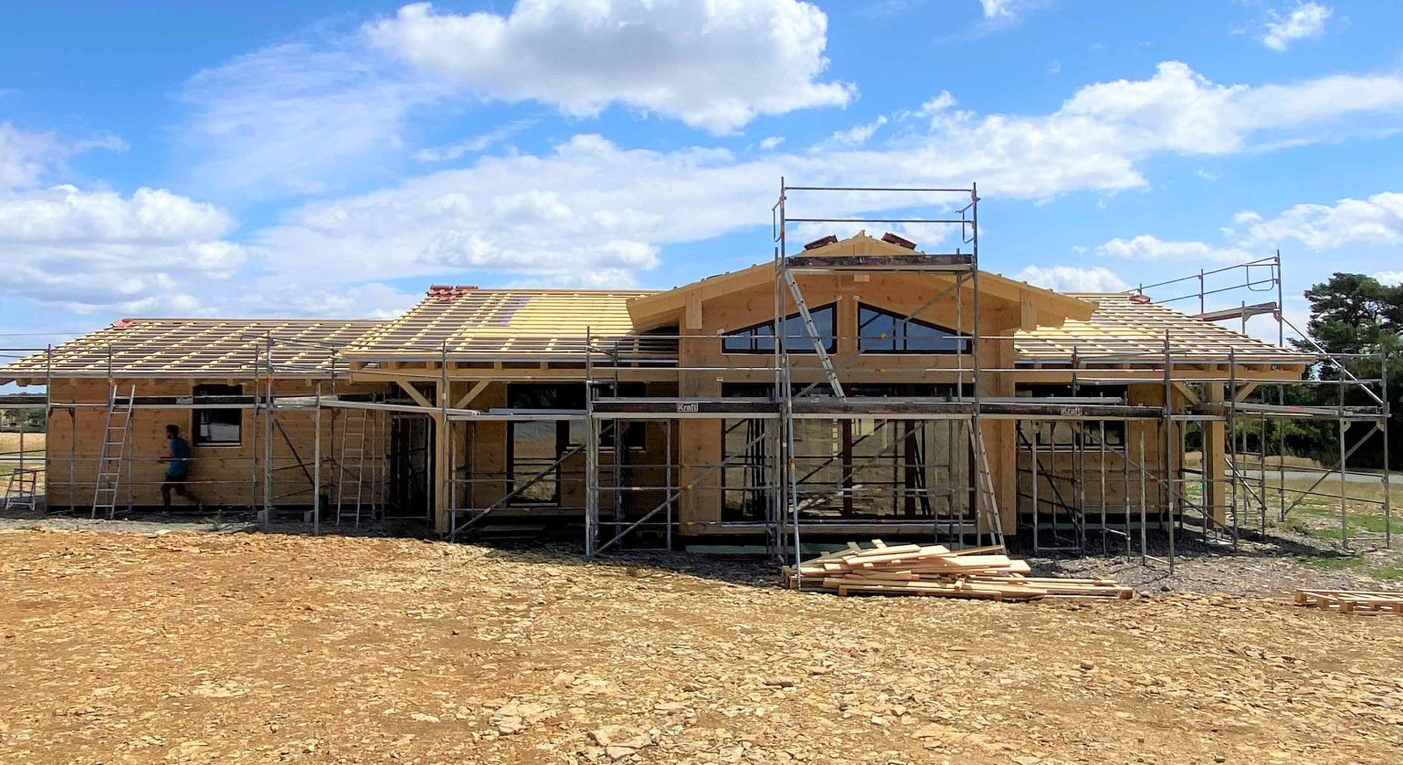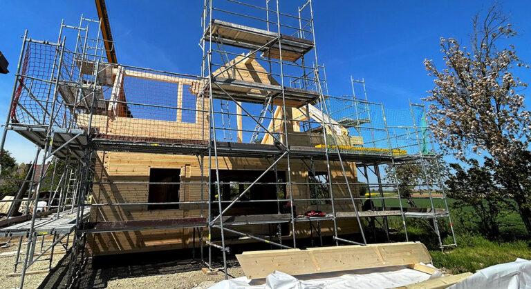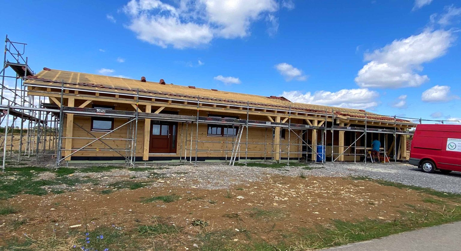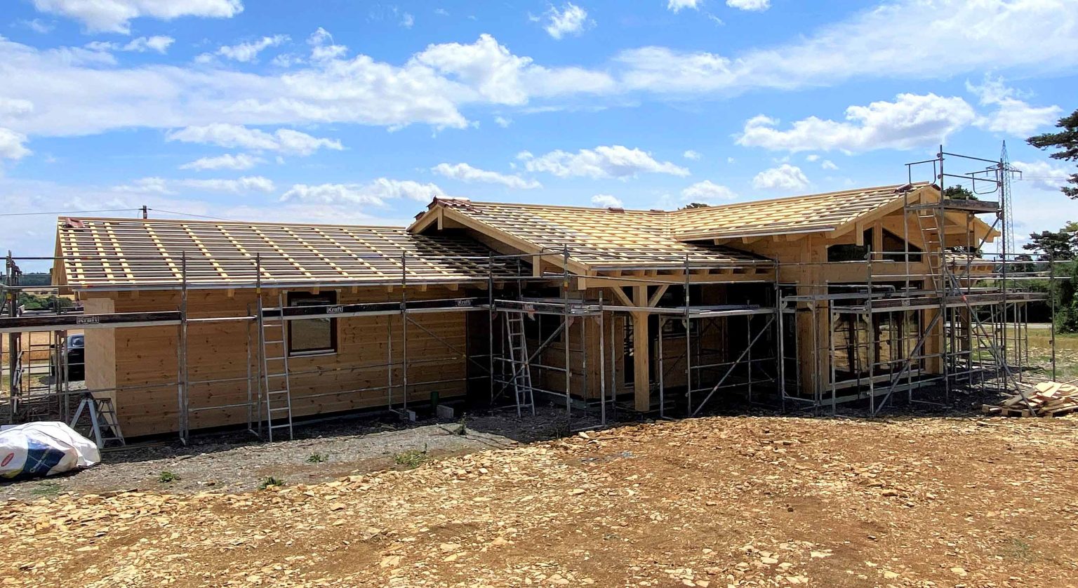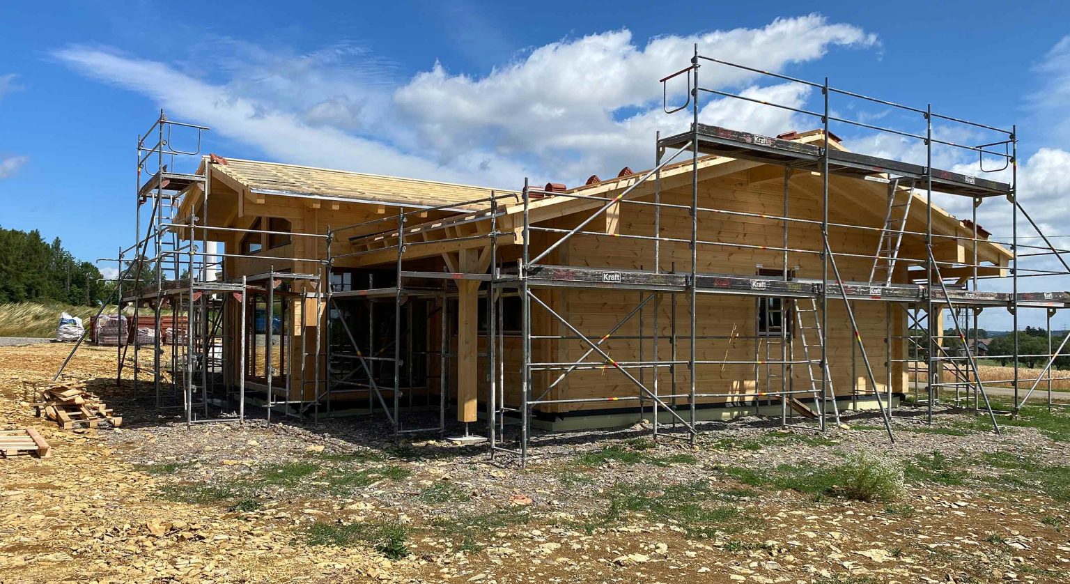 Blockhaus in ökologischer Bauweise erfüllt den Wohntraum der Bauherrschaft auf dem eigenen Pferdehof. Die 20cm dicken Polarkiefernwände sind durch und durch massiv, ganz ohne Dämmung. Die Architektur ist ebenerdig, also eingeschossig; ein Carport, eine Garage und ein Schuppen ergänzen das Ganze.