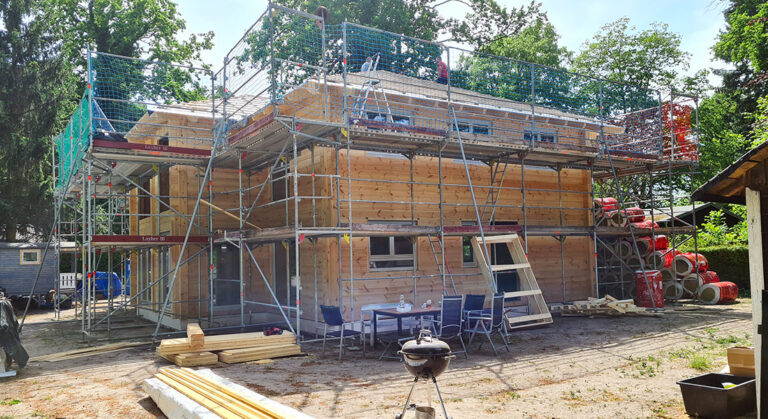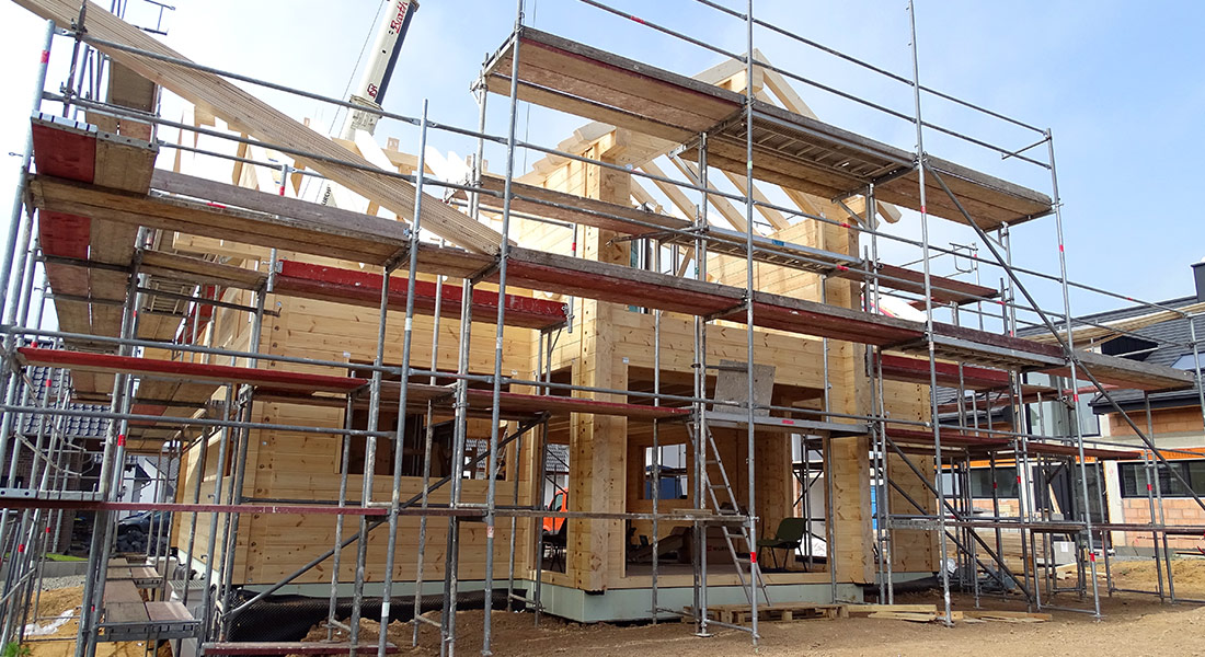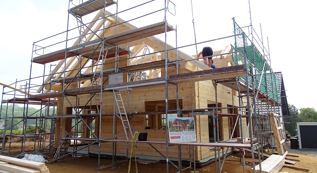 In Vollmontage wird dieses Blockhaus ökologisch gebaut. Das bedeutet, die Bauherrschaft packt nicht selbst bei der Hausmontage mit an, sondern lässt alles von den Fullwood-Profis machen – entspannter geht es nicht. Gebaut wird auf dem Nachbargrundstück des alten Hauses der Bauherrin. Für die Katzen ist ein eigener Katzenbalkon eingeplant, des Weiteren leben noch Hunde mit im zukünftigen Eigenheim und die eigenen Pferde grasen am Blockhaus. Für die zweite Doppelhaushälfte wird alles vorbereitet.