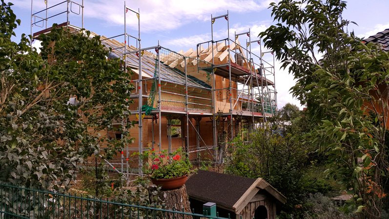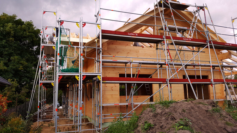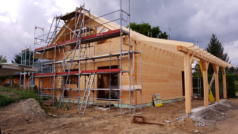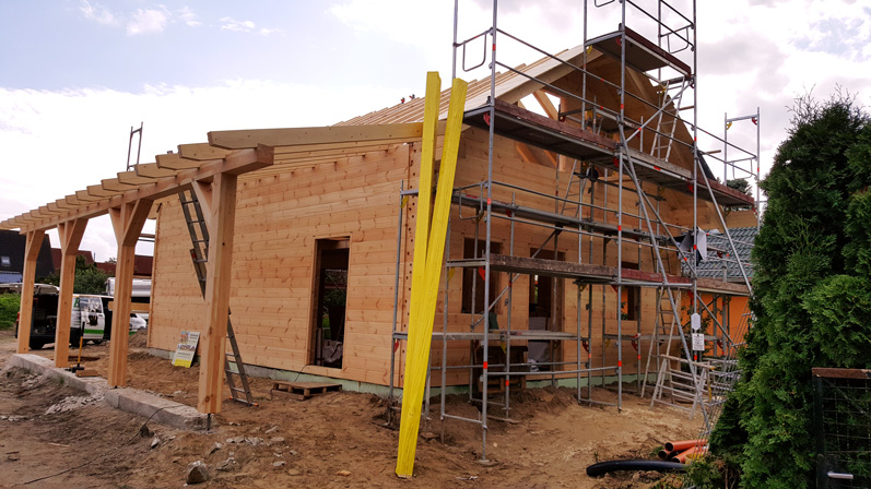 Die massiven Wände sind einmal mehr durch und durch aus Polarkiefernholz und werden nach der individuellen Blockhaus Planung exakt im Werk vorgefertigt und erst dann in wenigen Elementen zur Baustelle gebracht. Dieses Blockhaus in Brandenburg wird als Richtmeistermontage in wenigen Tagen montiert. Zunächst folgt die Dacheindeckung und der Einbau von Fenstern und Türen, danach geht es an den Innenausbau. Dieser erfolgt in Eigenregie seitens Bauherrschaft.