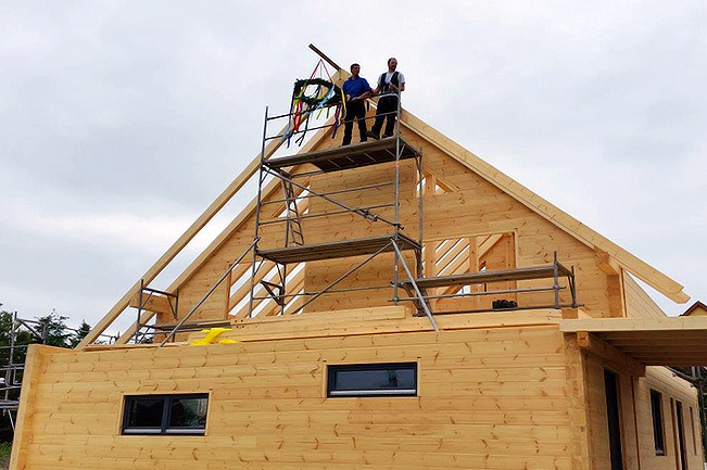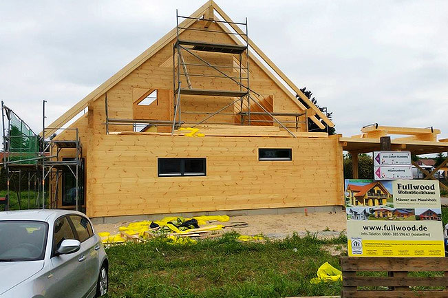 Die Bauherren sind begeistert von der 20cm dicken Massivholzwand. Deren Setzungsfreiheit garantiert kein späteres, wiederholtes nachjustieren oder nacharbeiten am Blockhaus. Außerdem ist die einschalige Kiefernholzwand von Fullwood Wohnblockhaus absolut winddicht und sehr energieeffizient. Die Wünsche der Bauherrschaft beinhalten anderthalb Geschosse, einen sichtbaren Dachstuhl, einen modernen Erker mit viel Glas und ein Carport. Mit viel Eigenleistung und der Anleitung des Fullwood-Richtmeisters verwirklichen die Bauherren ihren Traum vom Blockhaus.