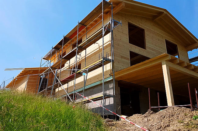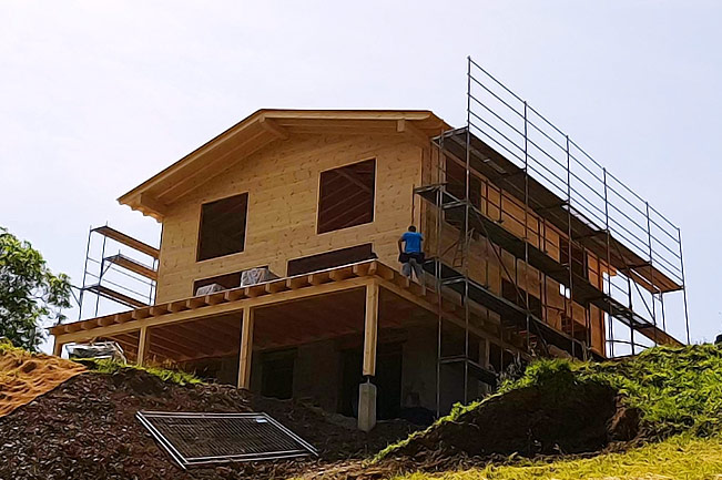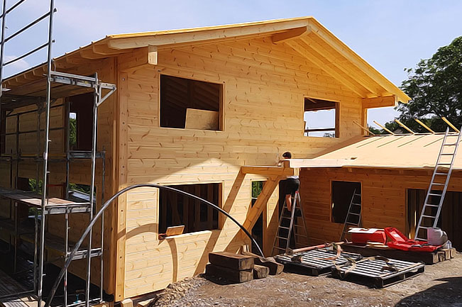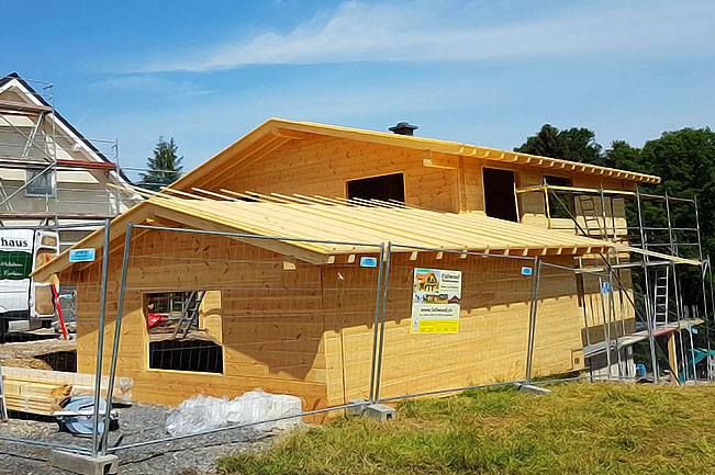 Wegen des Gefälles wird zuerst ein Kellergeschoss aus Beton gebaut, auf das dann das Blockhaus gesetzt wird. Dank der setzungsfreien Wandelemente aus Polarkiefernholz gibt es keinerlei Schwierigkeiten die Holzwände mit dem Betonunterbau zu kombinieren. Das Blockhaus aufgrund des hohen Kniestocks und des flach geneigten Satteldachs zwei Vollgeschosse. Dies bewirkt viel Stellfläche im Obergeschoss. Die Bauherrschaft ist während der Bauphase sehr engagiert und mit viel Eigenleistung involviert. Ihr Blockhaus in Nordrhein-Westfalen baut die Baufamilie sowohl mit der einschaligen Blockwand als auch mit der Kombiblockwand.