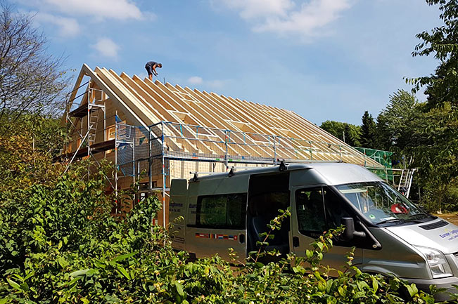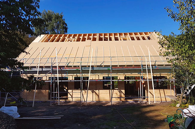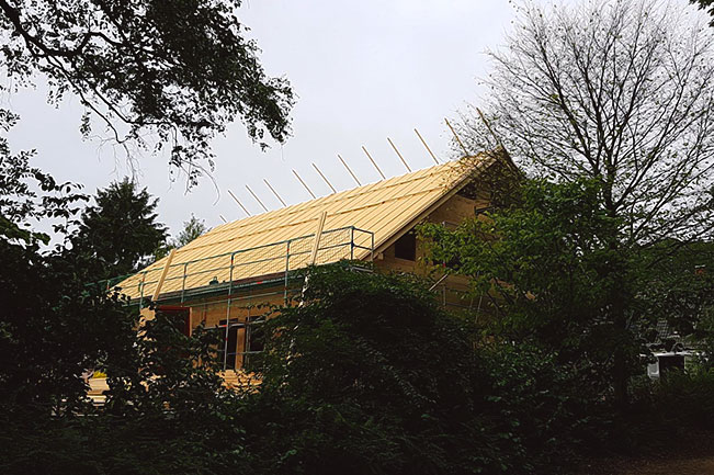 Der Bauherr selbst baut mit und übernimmt die Montage zusammen mit seinen beiden Söhnen und dem federführenden Fullwood-Richtmeister. Es ist das zweite Blockhaus in Bremen, das von Fullwood stammt - im Bremer Umland gibt es schon einige echte Fullwood-Blockhäuser. Sein "doppeltes Blockhaus" lässt der Bauherr mit der Kombiblockwand bauen.