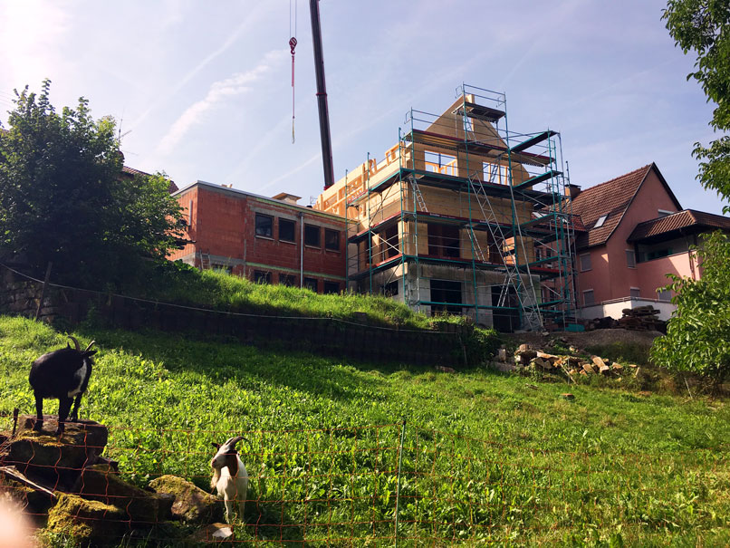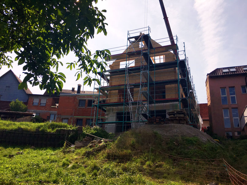 Hergestellt werden die leckeren Backwaren und Speisen im Blockhaus Untergeschoss und im Anbau (Ziegel). Das Blockhaus in Baden-Württemberg wird aus einer Kombination aus 20cm dicken Vollholzwänden und 27cm starken Vollholzwänden gebaut. Einer der Söhne der Baufamilie bekommt seine Wohnung im Dachgeschoss. Er kann im Blockhaus nicht nur den zarten Duft der massiven Kiefernwände genießen, sondern auch den verlockenden Gerüchen aus der Backstube erliegen.