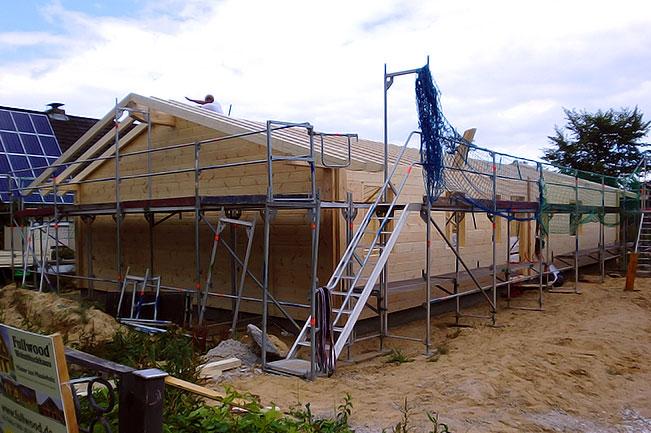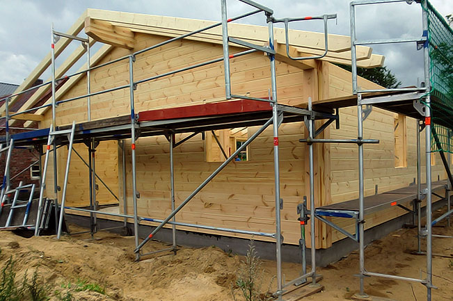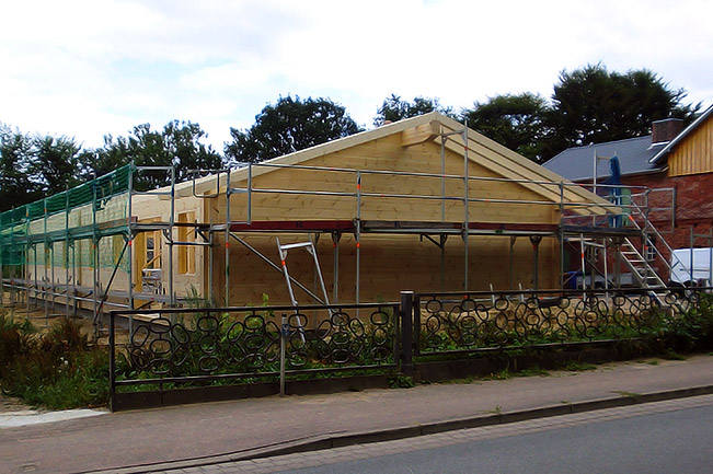 Hier entsteht im Kreis Segeberg ein eingeschossiges Mehrgenerationenhaus: Die Bauherrin plant eine Einliegerwohnung für die Familie ihrer Tochter in ihrem Blockhaus mit ein. Mit 9 x 19 Metern ist das Blockhaus ungewöhnlich lang und die Einliegerwohnung entsprechend großflächig. Verbaut wird hier die Kombiblockwand.