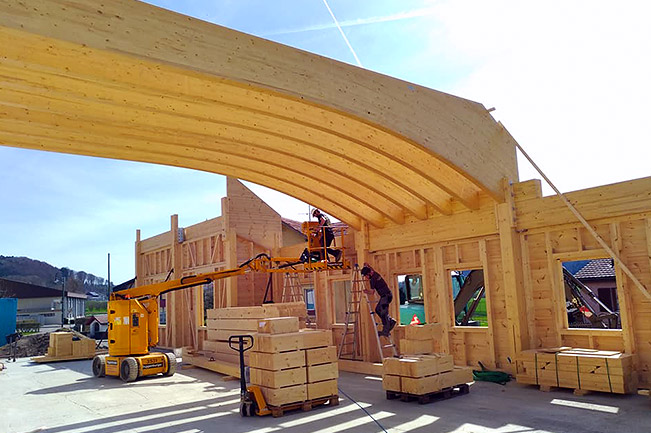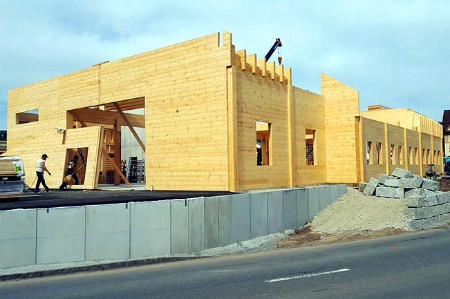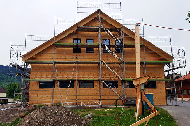 Nachdem unser Montage-Partnerunternehmer in der Schweiz ein eigenes, besonders großes Blockhaus für sich gebaut hat - siehe 'Blockhaus Luzern' (Holzhausgalerie) - baut er nun ein noch riesigeres Blockhaus als Gewerbehalle für seine Mitarbeiter. Somit schafft er perfekte, Mitarbeiter freundliche Arbeitsbedingungen zum Wohle seiner Angestellten. Das neue Gebäude besteht aus der Kombiblockwand, die genau wie ihre "große Schwester", die einschalige Vollholzwand, setzungsfrei, solide, wertbeständig und absolut winddicht ist. Wohlfühlambiente und gesundes Raumklima für die Mitarbeiter inklusive!
