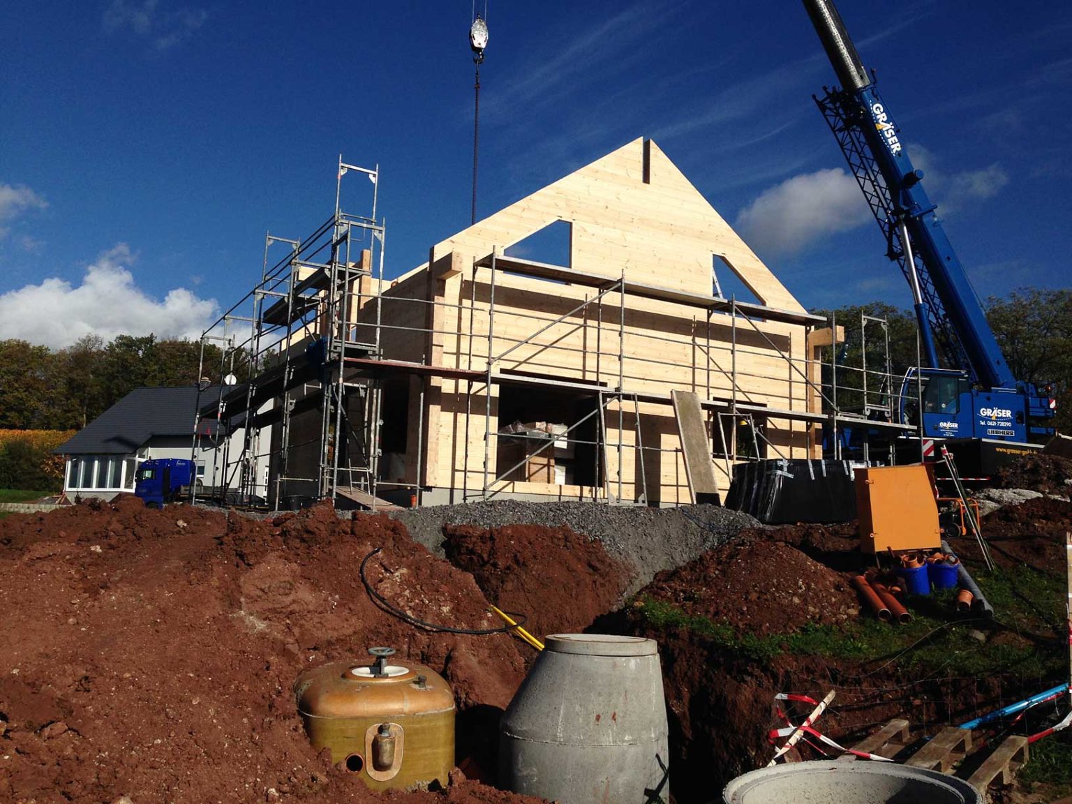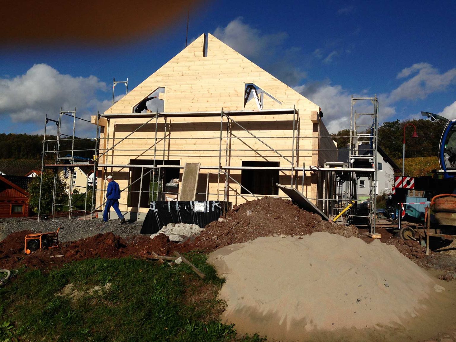 Auch bei dieser Richtmeistermontage passen die im Werk aus Polarkiefernholz vorgefertigten Wandelemente perfekt zueinander, so dass die Arbeit wie am Schnürchen läuft. Der Zeitplan wird eingehalten und die Bauherren können in absehbarer Zeit in ihr neues Holzhaus einziehen. Bis dahin gibt es im Holzhaus selbst aber noch viel zu tun: Trennwände aufstellen; Elektro-, Heizungs- uns Sanitärinstallationen verrichten; Böden verlegen und einiges mehr. Bis Weihnachten heißt es also noch "Schaffe, schaffe, Häusle baue.", dann gibt es erst einmal ein paar Tage Urlaub.