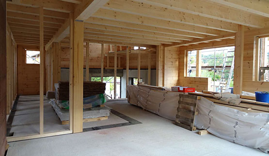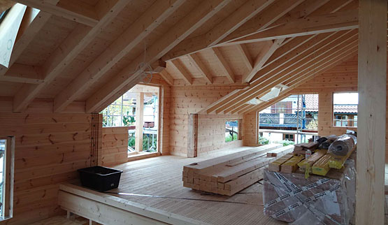 Das Blockhaus wird unter der Regie des Richtmeisters zusammen mit ortsnahen Zimmermännern passgenau aufgebaut. Die Bauherren haben sehr klare Vorstellungen, was ihr Blockhaus betrifft, und Fullwood setzt alles bis ins kleinste Detail um. Ausschließlich ein "echtes", komplett massives Blockhaus kommt für die Bauherren in Frage und dies in möglichst setzungsfreier Bauweise, wie sie von Fullwood in der Werkstatt hergestellt wird. Durch die gut durchdachte Vorplanung und einen minutiösen Bauzeitenplan gehen die weiteren Gewerke, wie Elektro, Sanitär und Heizung, durch örtliche Firmen zügig weiter.