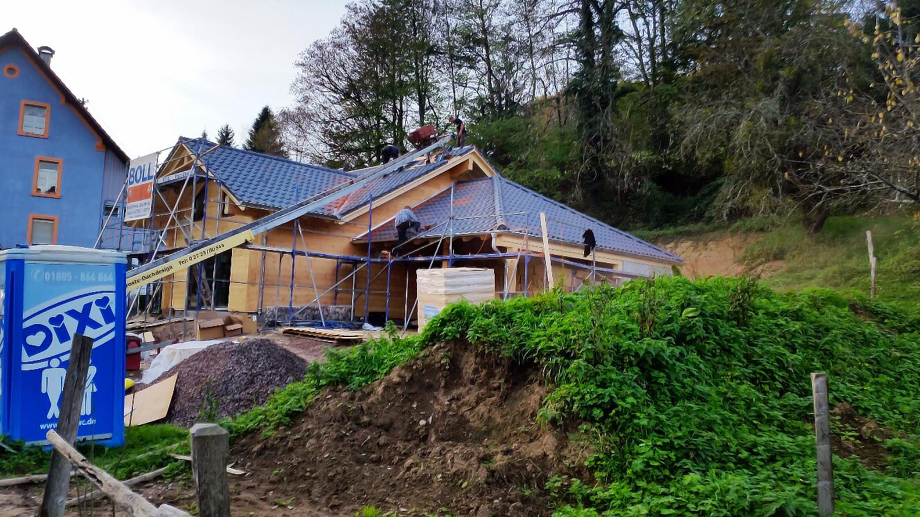 Das neue Blockhaus ist noch nicht ganz fertig, zeigt aber schon sein optisches Potential. Neben den hellen Massivholzwänden (Nordische Kiefer) gefällt beim diesem massiven Blockhaus vor allem die Architektur mit drei Giebeln und einem Garagenanbau mit angedeutetem Walmdach. Die Fullwood-Monteure leisten wieder ganze Arbeit bei der Blockhaus-Montage und sorgen für positive Verwunderung in der Nachbarschaft. Dass ein massives Blockhaus in nur wenigen Tagen schon im Rohbau steht, hätte niemand vermutet. Auch die Dachdecker kommen flott voran, so dass die Handwerker für die Ausbauarbeiten im Hausinnern schon in den Startlöchern stehen und "mit den Hufen scharren". Derweil müssen sich die frischgebackenen Hauseigentümer nur auf den Einzug und ihr Leben im original Blockhaus von Fullwood freuen.