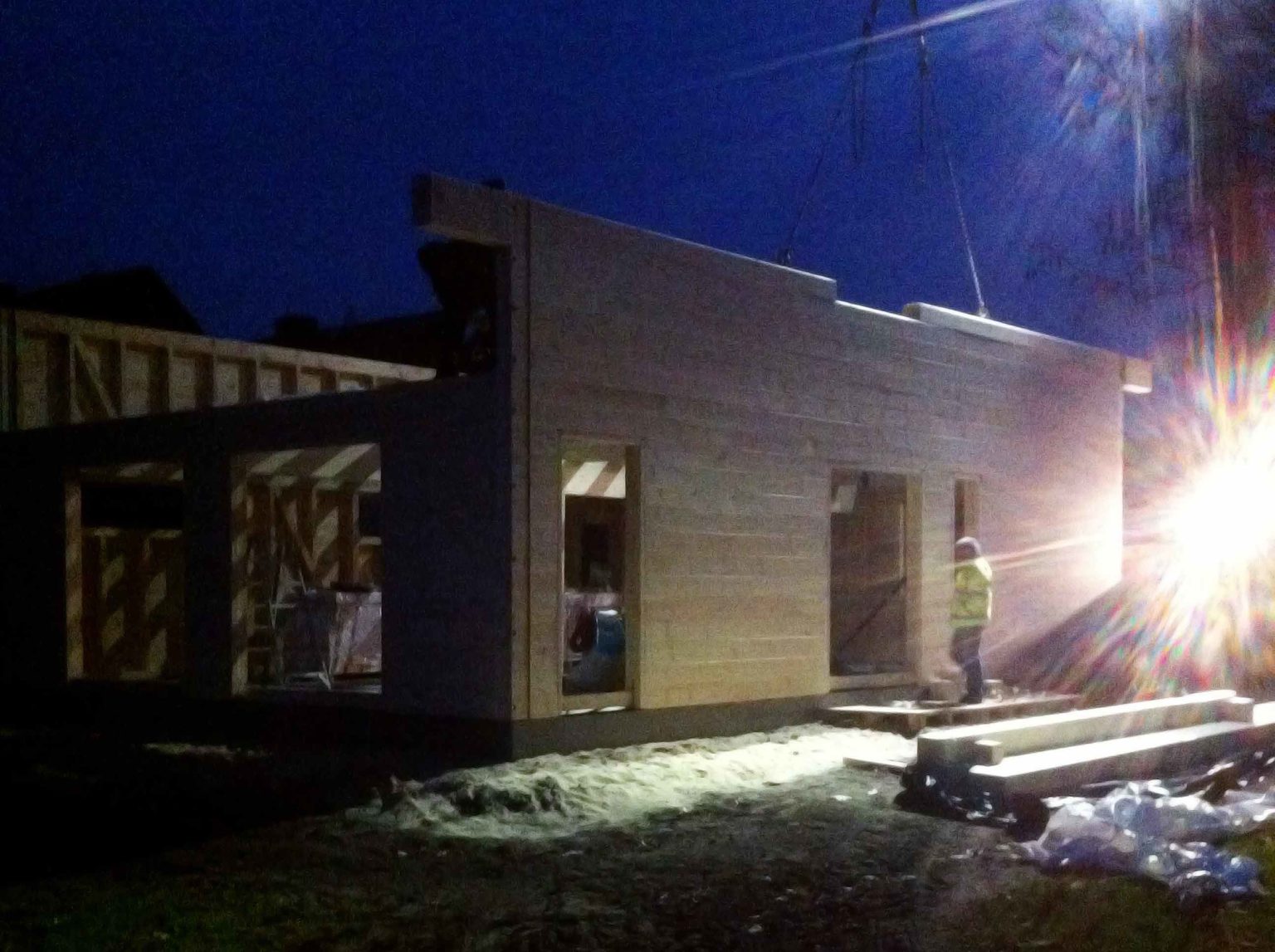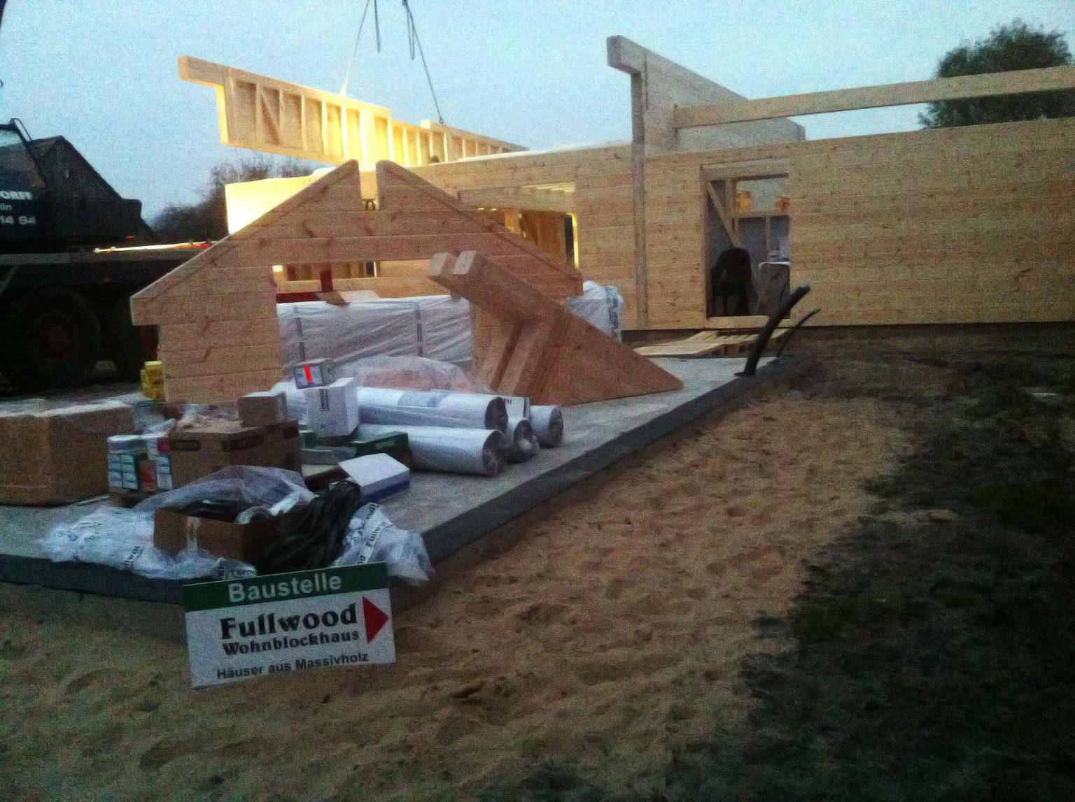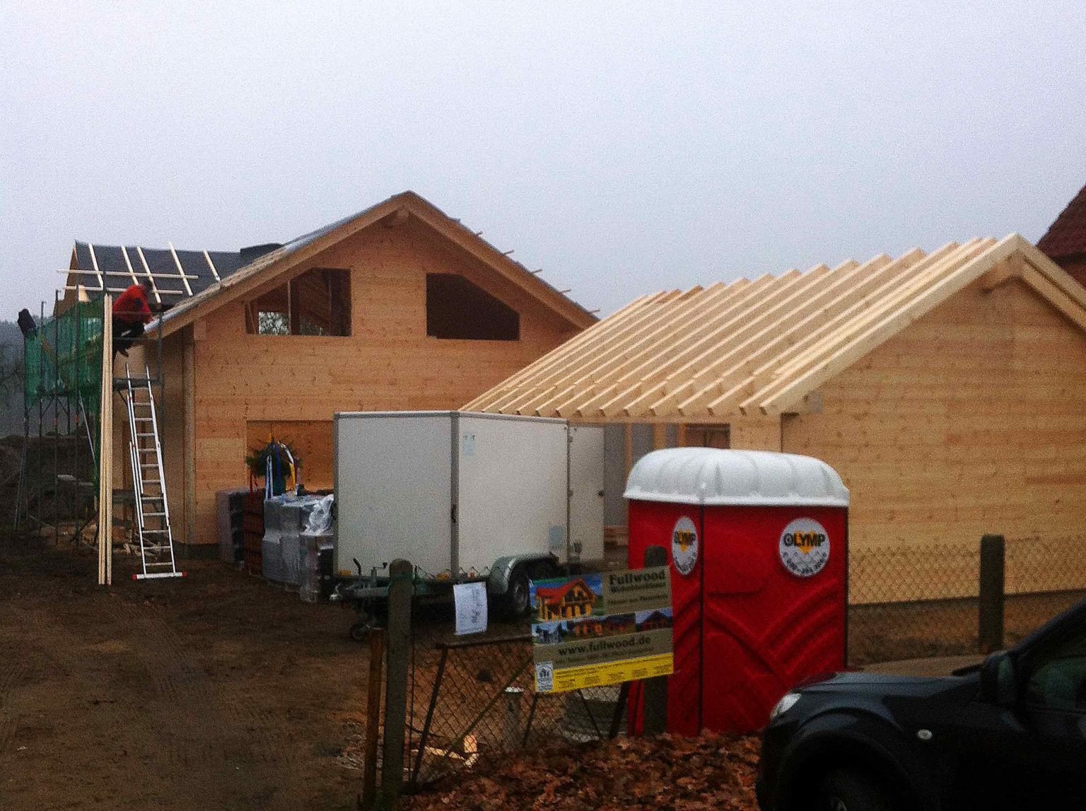 Fast anderthalb Jahre dauert es, bis die Bauherren endlich die Baugenehmigung für ein Blockhaus bekommen. Gegen viele Vorurteile und Widerstände seitens Bauamt setzen sich die glücklichen Bauherren letztlich mit Hilfe des Blockhaus Herstellers durch. Der Hausbau selbst verläuft seitdem reibungslos und schnell. Eine große Doppelgarage wird gleich mitgebaut, natürlich auch aus Massivholz.