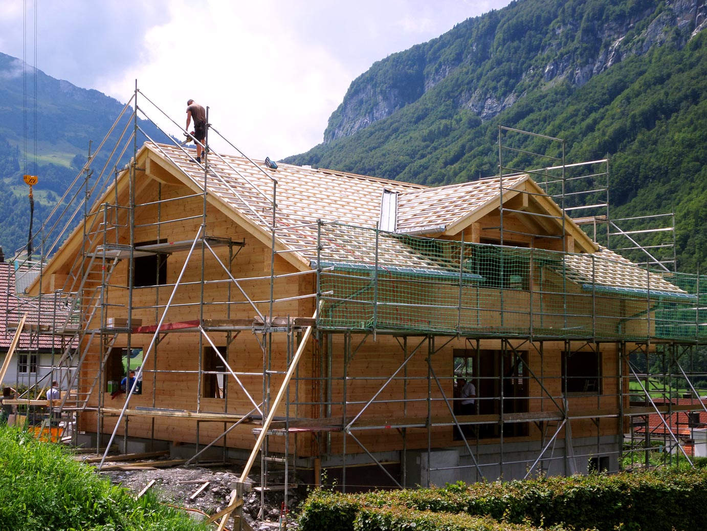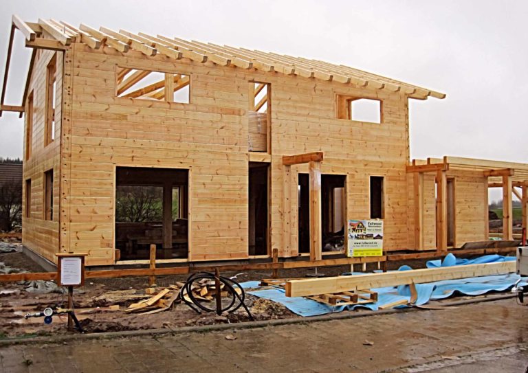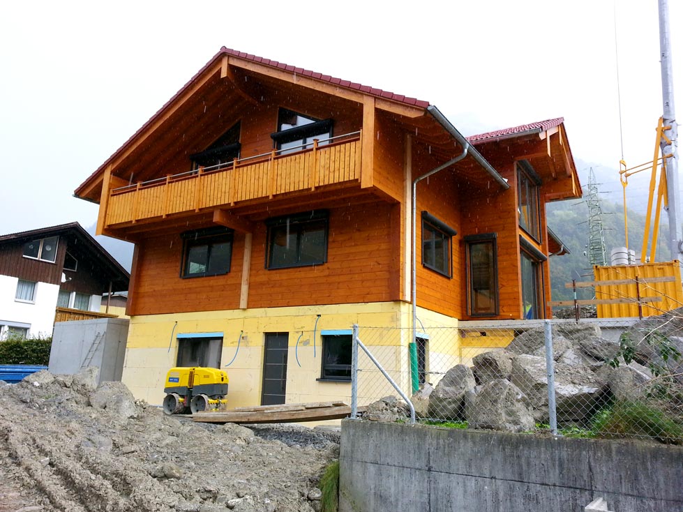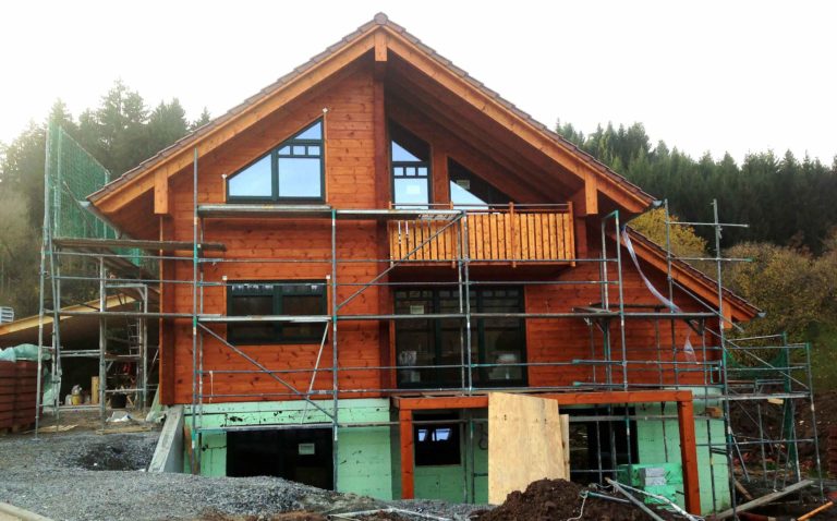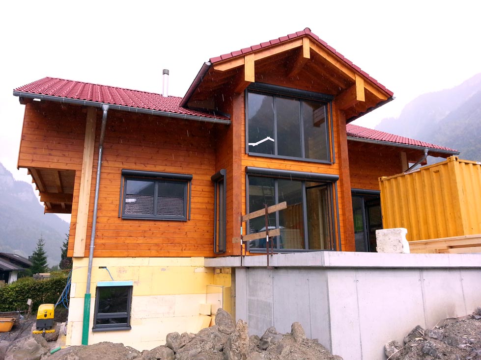 Die Bauherren dieses massiven Blockhauses, eine Schweizerin und ein Deutscher, entschieden sich für die extra dicke 27-er Vollholzwand, da diese noch besser dämmt als die der deutschen EnEV entsprechende 20-er Blockwand. Wie in allen Gebirgsregionen, wo Fullwood Wohnblockhäuser baut, musste auch bei diesem Blockhaus die Schneelast extra berechnet werden, und das Dach entsprechend konstruiert werden. Kein Problem für die erfahrenen Ingenieure von Fullwood! Aufgrund der leichten Hanglage, unterkellerten die Bauherren ihr Blockhaus und gewannen dadurch zusätzliche Räume mit großen Fenstern. Balkone und eine große Terrasse, um die herrliche Gebirgslandschaft von dort zu betrachten, bekam das idyllisch gelegene Blockhaus Schweiz natürlich auch. Unsere Monteure sind wie immer gerne in die Schweiz gereist, um dort in üblicher Manier schnell und sorgfältig die vorgefertigten Wandteile aus massiven Kiefernbohlen zu montieren. Der Keller wurde zuvor von einem ortsansässigen Unternehmen gebaut; auch Innenarbeiten, wie beispielsweise Sanitär, Heizung und Fliesenlegen, haben lokale Fachfirmen übernommen. So profitieren auch Schweizer Handwerksbetriebe an dem deutschen Blockhaus.