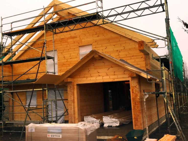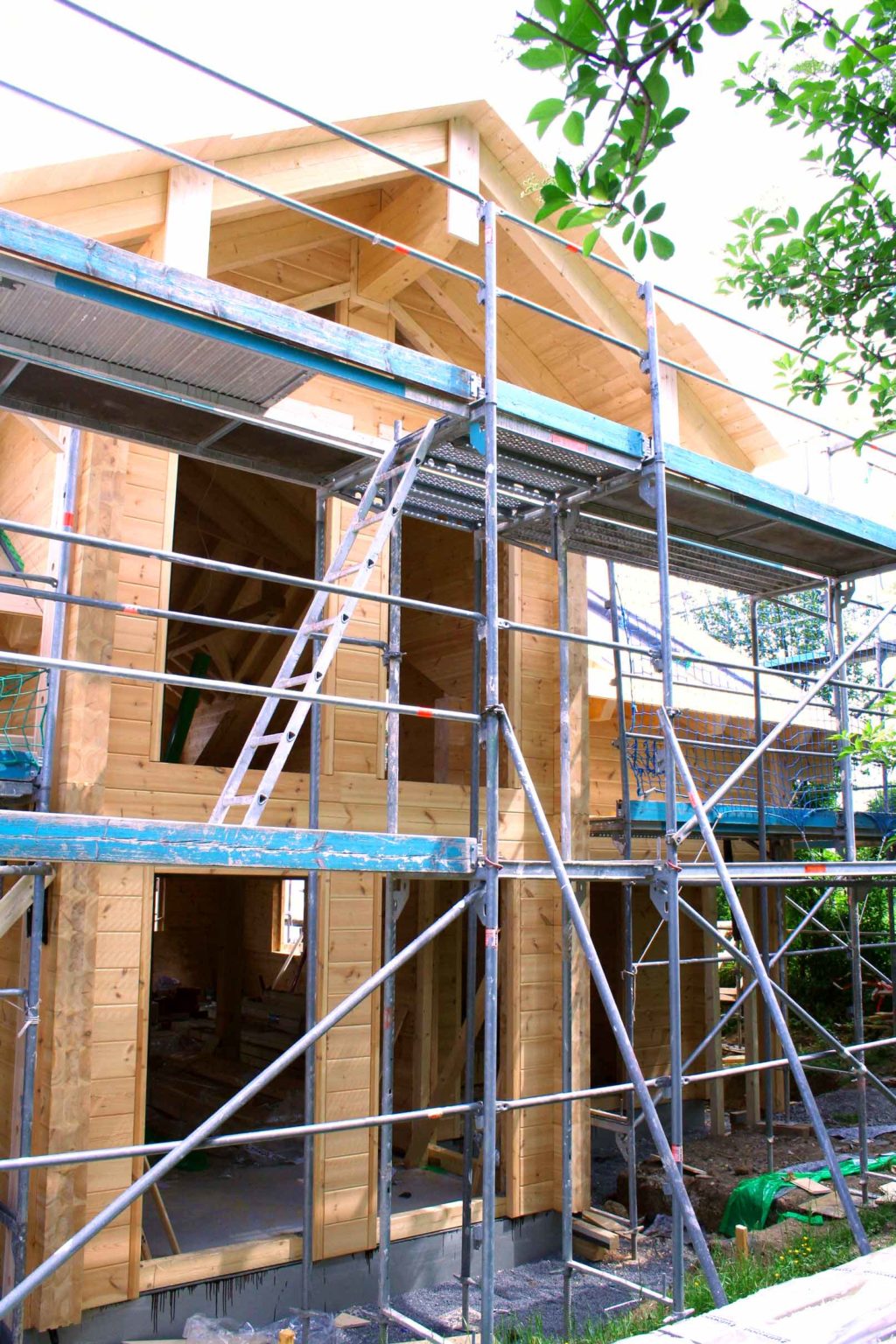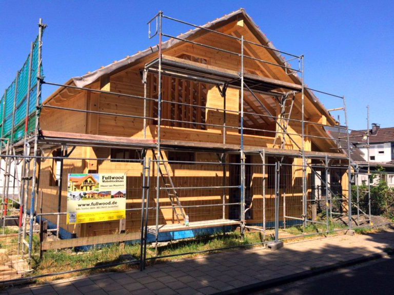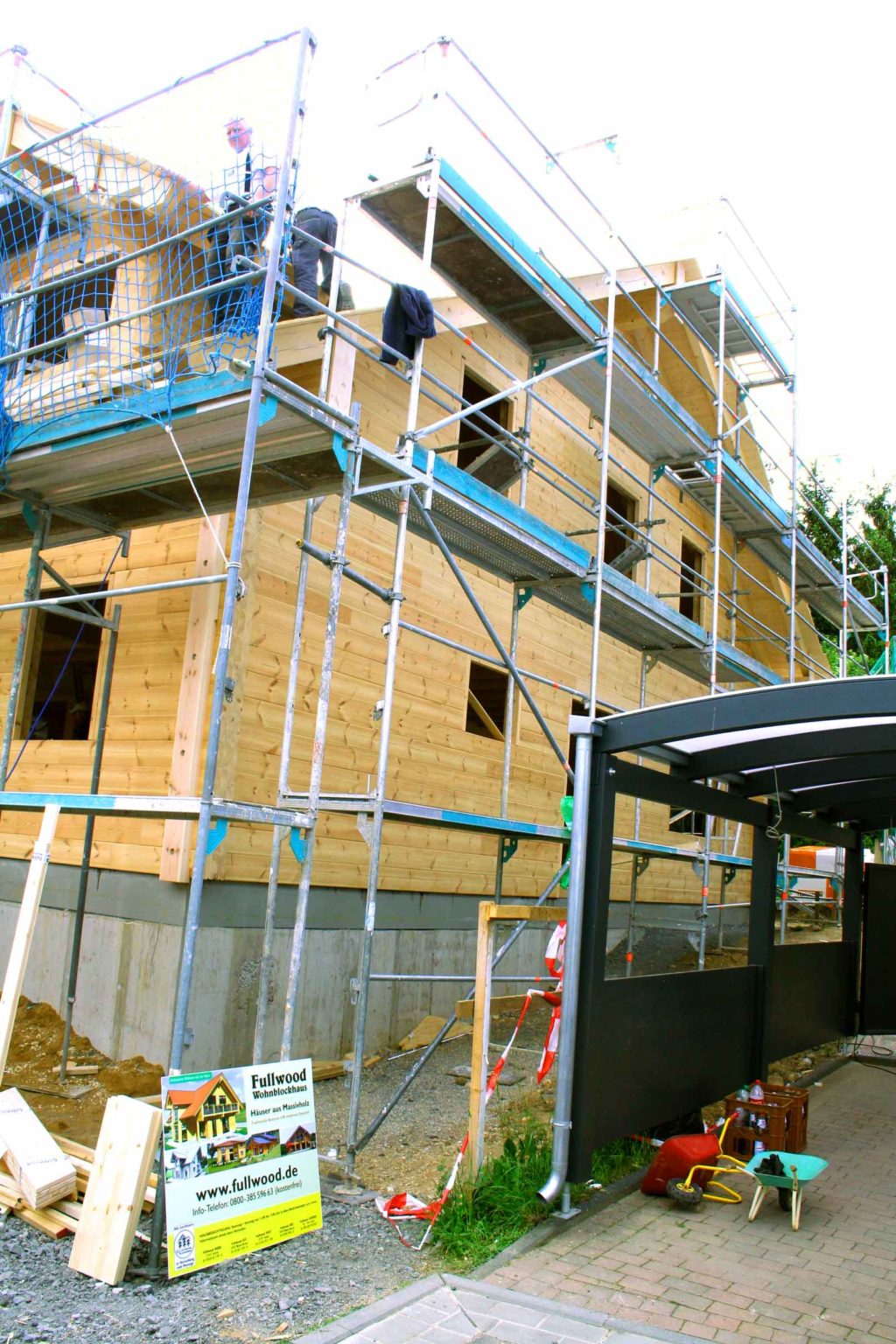 Horizontale und vertikale Offenheit (bis zum offenen Sichtdachstuhl) im Wohnbereich bestimmen die Innenarchitektur des großzügig dimensionierten Blockhauses bei Köln. Ein moderner, komplett verglaster Rechteckerker lässt viel Tageslicht herein und gestaltet das massive Blockhaus innen wie außen mit. Die Bauherren verlassen sich voll und ganz auf die erfahrenen Fullwood-Monteure, die momentan fleißig auf der Baustelle wirken. Nach der raschen Wandmontage – inklusive Dachstuhl - erfolgt derzeit die Dacheindeckung. Fenster- und Türeneinbau sowie Innenwandmontage werden darauf folgen, bevor Elektro-, Sanitär- und Fliesenfachhandwerker mit ihren Arbeiten beginnen. Die Kanäle für die Elektrokabel wurden bereits im Vorfeld genau geplant und in die Vollholzwände gebohrt. Von Tag zu Tag nimmt das exklusive Blockhaus, das von einem externen Architekten der Bauherren begleitend mit entworfen wurde, immer mehr seine endgültige Gestalt an. Die Vorfreude auf den baldigen Einzug ins eigene Blockhaus nimmt währenddessen proportional zum Baufortschritt zu.