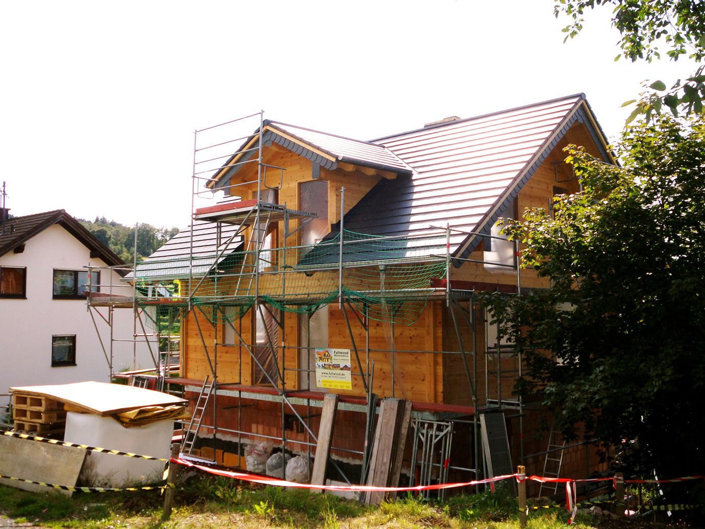 Nur mit Hilfe des Fullwood-Richtmeisters und ein paar befreundeten Helfern errichten diese Bauherren ihr massives Blockhaus. Wegen der extremen Hanglage sind sogar zwei Kellergeschosse notwendig, auf die das anderthalb geschossige Blockhaus gestellt wird. Sehr viel Platz für die ganze Bauherrenfamilie kommt dabei heraus. Glücklicherweise sind neben dem erprobten Richtmeister auch alle Helfer schwindelfrei, was besonders an der Talseite des Gebäudes von Bedeutung ist. Da auf dem schwierigen Grundstück kein Platz für ein Zwerchhaus oder einen Erkervorbau vorhanden ist, haben sich die Bauherren für eine schöne, große Gaube mit zwei bodentiefen Fenstern an der straßenseitigen Traufseite entschieden.