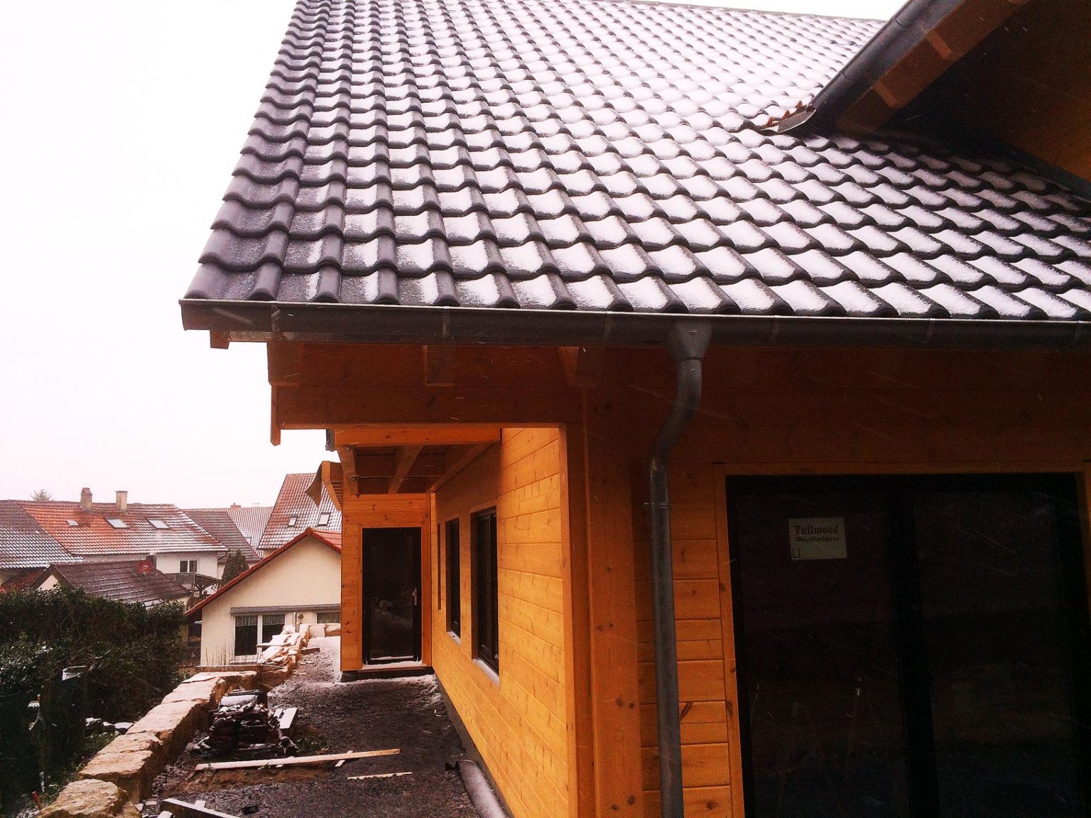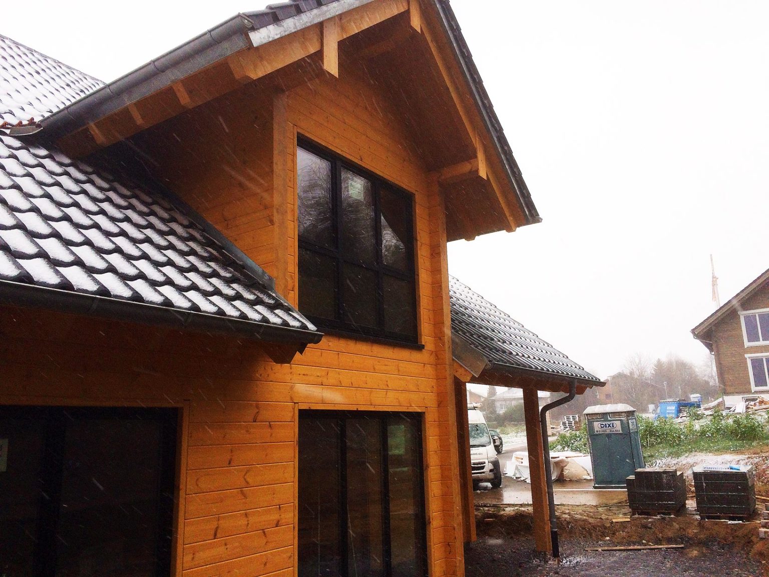 Mit Hilfe des Fullwood-Richtmeisters wird dieses massive Blockhaus, trotz ungünstiger Wetterverhältnisse, in wenigen Tagen von den Bauherren aufgebaut. Auch eine Garage wird gleich mit ans Blockhaus gebaut. Mittlerweile ist das Blockhaus rundum dicht, besitzt Dach, Türen und Fenster, so dass die Ausbauarbeiten komfortabel und „bequem“ im Trockenen durchgeführt werden können. Dafür engagieren die Bauherren örtliche Fachhandwerksbetriebe. Schon im Frühjahr kann die Eigentümerfamilie einziehen.