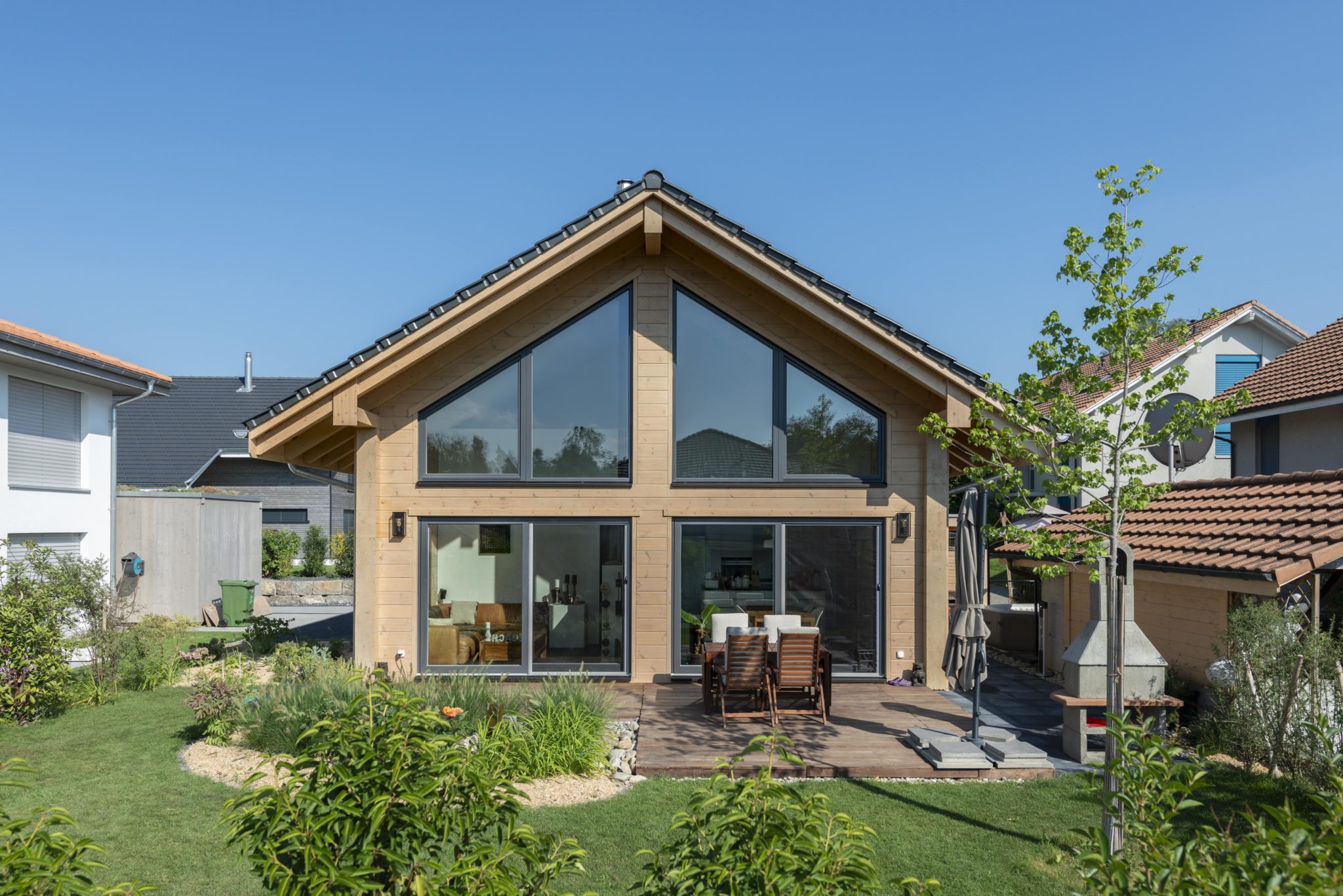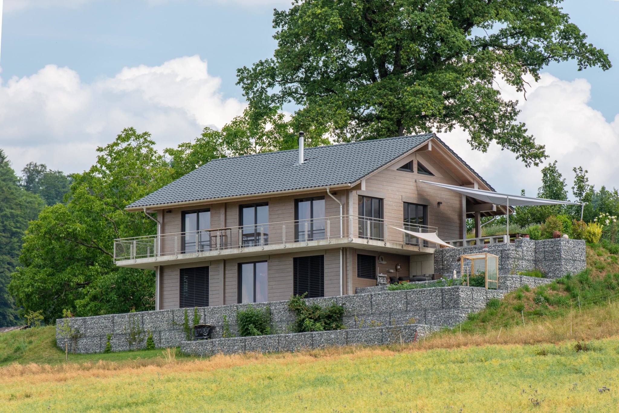 In Wolfhalden, bei St. Gallen in Bodenseenähe, finden Sie unser Musterhaus “am Bächli“, Ostschweiz. An einem Hang gelegen lädt das anderthalbstöckige Holzhaus zum Träumen ein. Kommen Sie gern zu einem Besichtigungstermin vorbei und lassen Sie sich zu den umfassenden Möglichkeiten beim Bau eines Fullwood Wohnblockhauses in der Schweiz beraten.