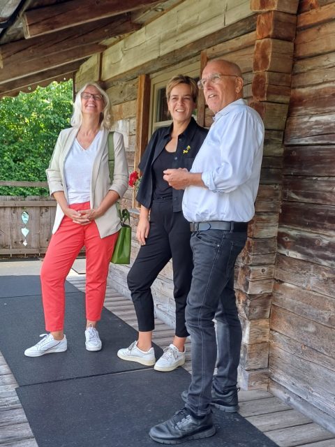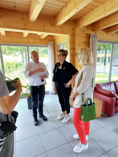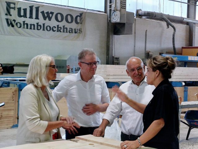 Begleitet von der Bürgermeisterin der Stadt Lohmar, Claudia Wieja, besichtigte die Ministerin begeistert unsere Musterhäuser und ließ sich durch die Produktion führen. Im historischen Musterhaus „Alm aus dem Schmirntal“ fühlte sich die gebürtige Schwäbin an traditionelle Blockhäuser aus ihrer bayerischen Heimat erinnert.