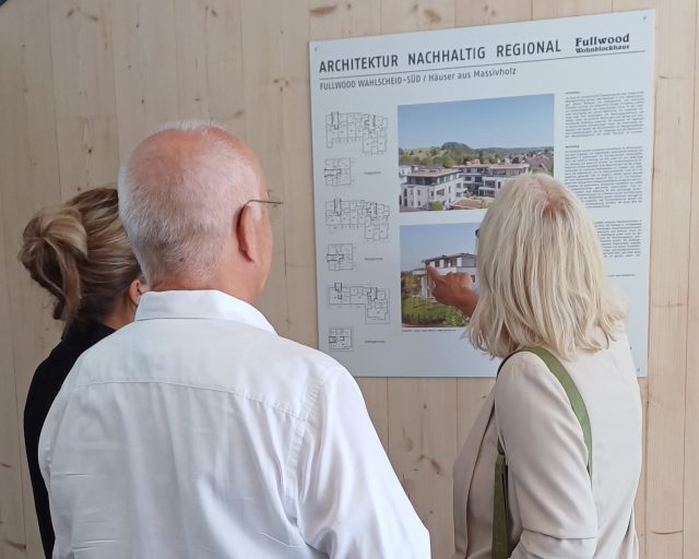 Die Bürgermeisterin zeigt der Ministerin das ökologische Mehrfamilienprojekt in Lohmar-Wahlscheid. Fullwood hatte die Ausschreibung der Stadt Lohmar für dieses nachhaltige Wohnungsbauprojekt gewonnen und in kürzester Zeit realisiert.